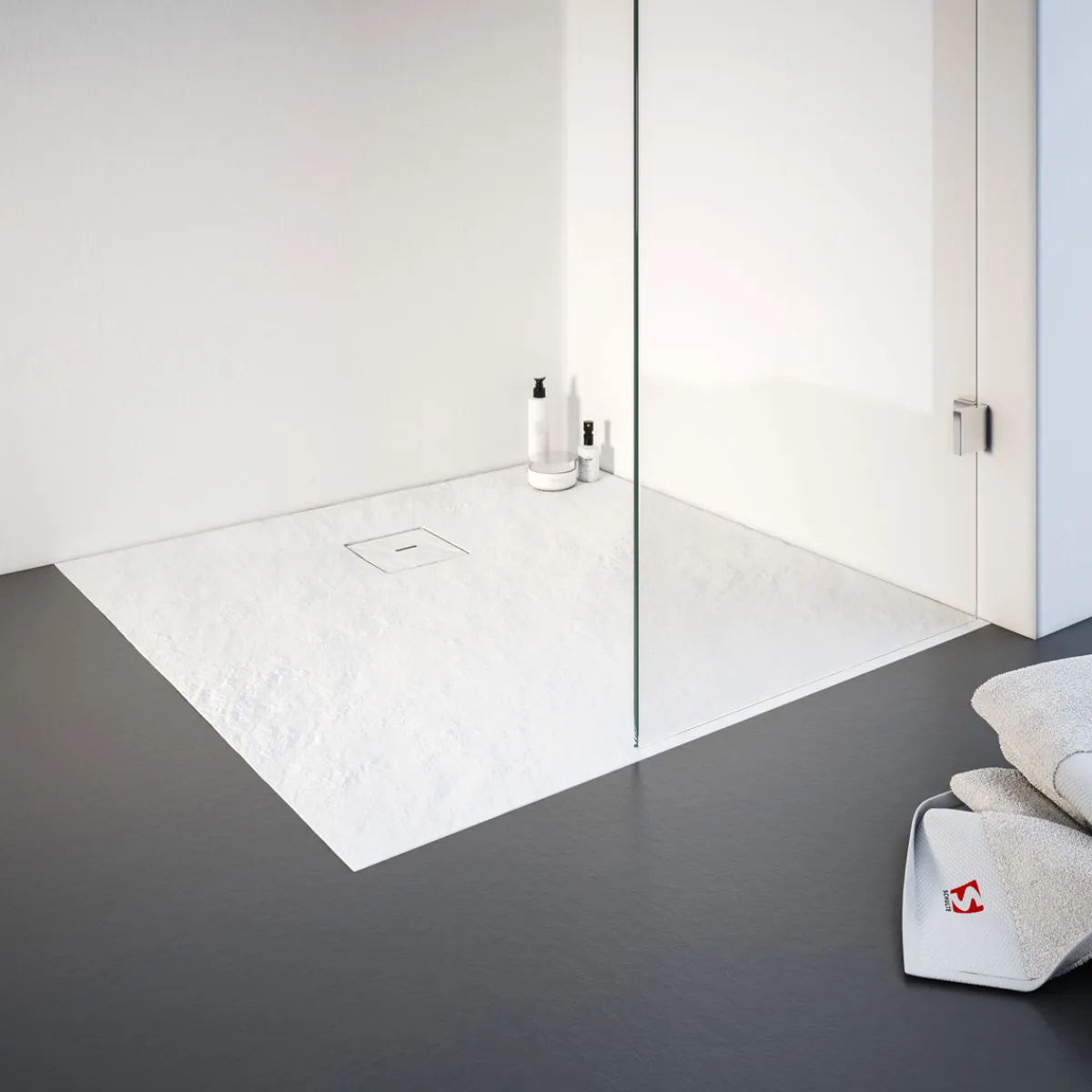- Eingearbeitetes Gefälle für einen optimalen Wasserabfluss, Oberfläche aus farbigem Naturstein in alpinweißer Steinstruktur