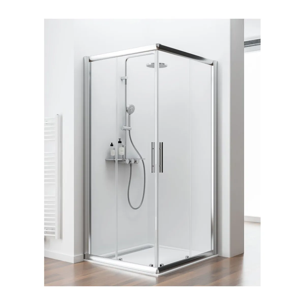 Der Eckeinstieg II der Serie Kristall/Trend von Schulte besteht aus insgesamt vier vollgerahmten Glaselementen. Die dominanten Profile in Chromoptik erzeugen ein modernes Design der Duschkabine und verleihen ihr außerdem eine gute Dichtigkeit. Des Weiteren erzeugen die beiden Schiebetüren einen großzügigen Eckeinstieg in den Duschbereich, verhalten sich aber ebenso platzsparend: Die zur Seiten öffnenden Duschtüren ragen zu keinem Zeitpunkt in den Raum hinein. Die gut in der Hand liegenden, formschönen Stabgriffe runden den Look der Kabine optimal ab.
