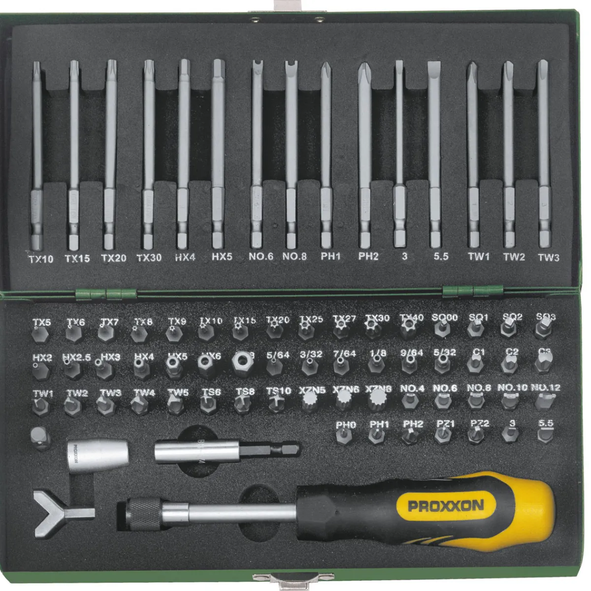 Wer auf der Suche nach einem hochwertigen Bit-Set ist, sollte sich den Proxxon Industrial Sicherheits- und Spezialbit-Satz genauer anschauen. Mit seinen zahlreichen Bits sowie Zubehör wie Schraubendreher oder Magnethalter bietet es alles was man braucht. Besonders positiv hervorzuheben ist das Material aus Chrom-Molybdän-Vanadium-Stahl sowie die Möglichkeit auch exotische Formen zu lösen oder festzuziehen.