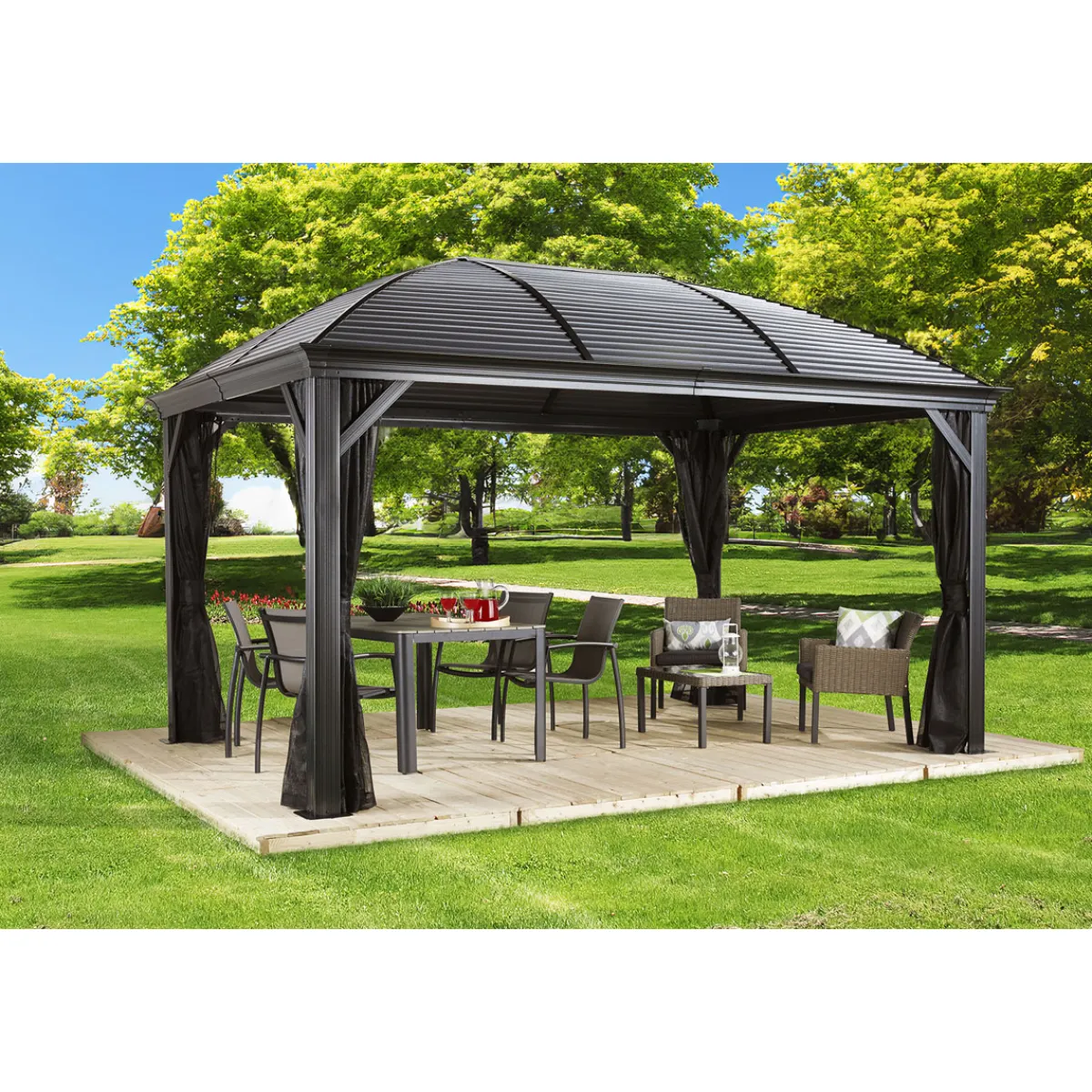 Besonderheiten: * Konzipiert für hohe Schneelasten von bis zu 150kg/m² * Dach aus galvanisiertem Stahl * Integrierte Regenrinne * Witterungsbeständig * Inkl. Moskitonetzen * Für den ganzjährigen Außenbetrieb entwickelt