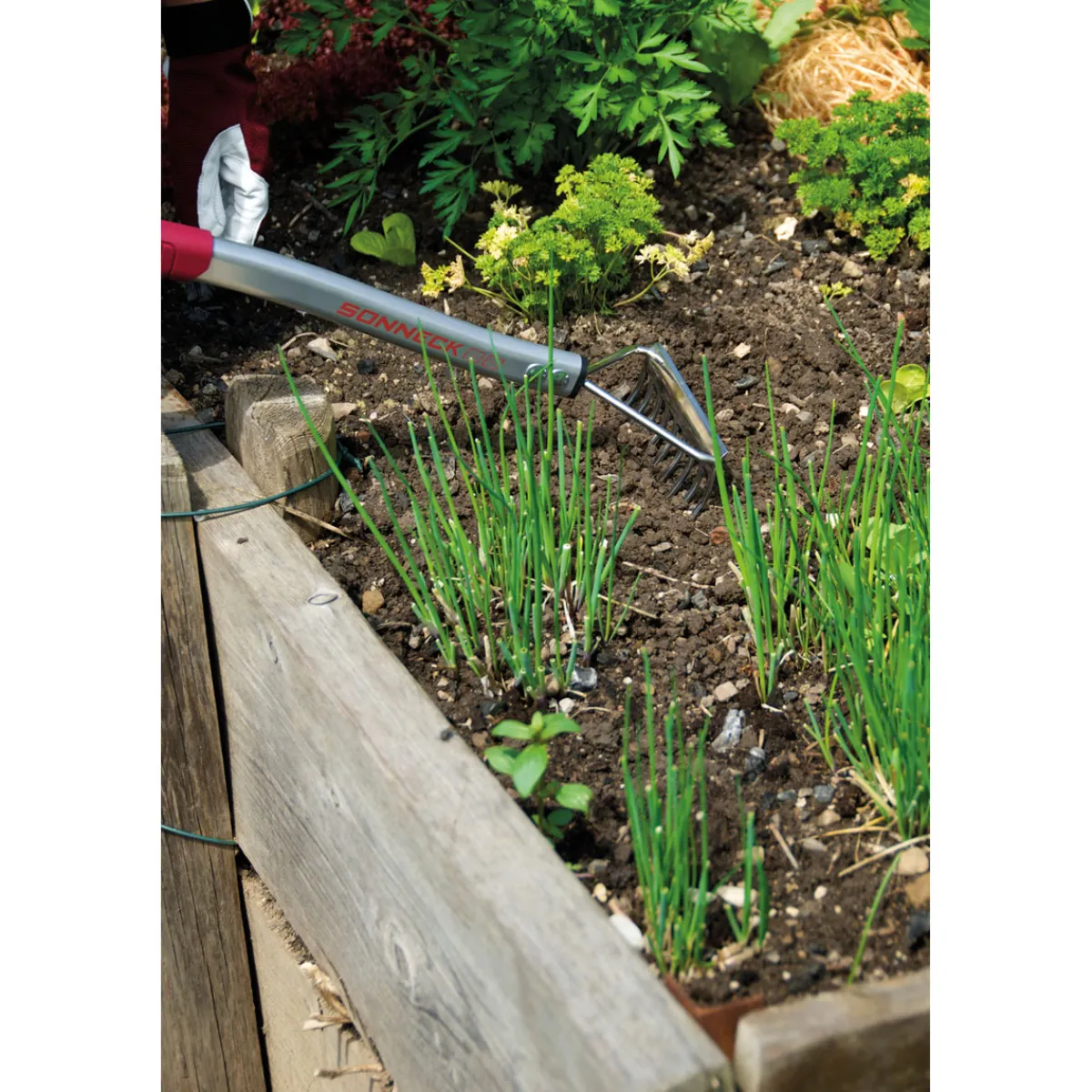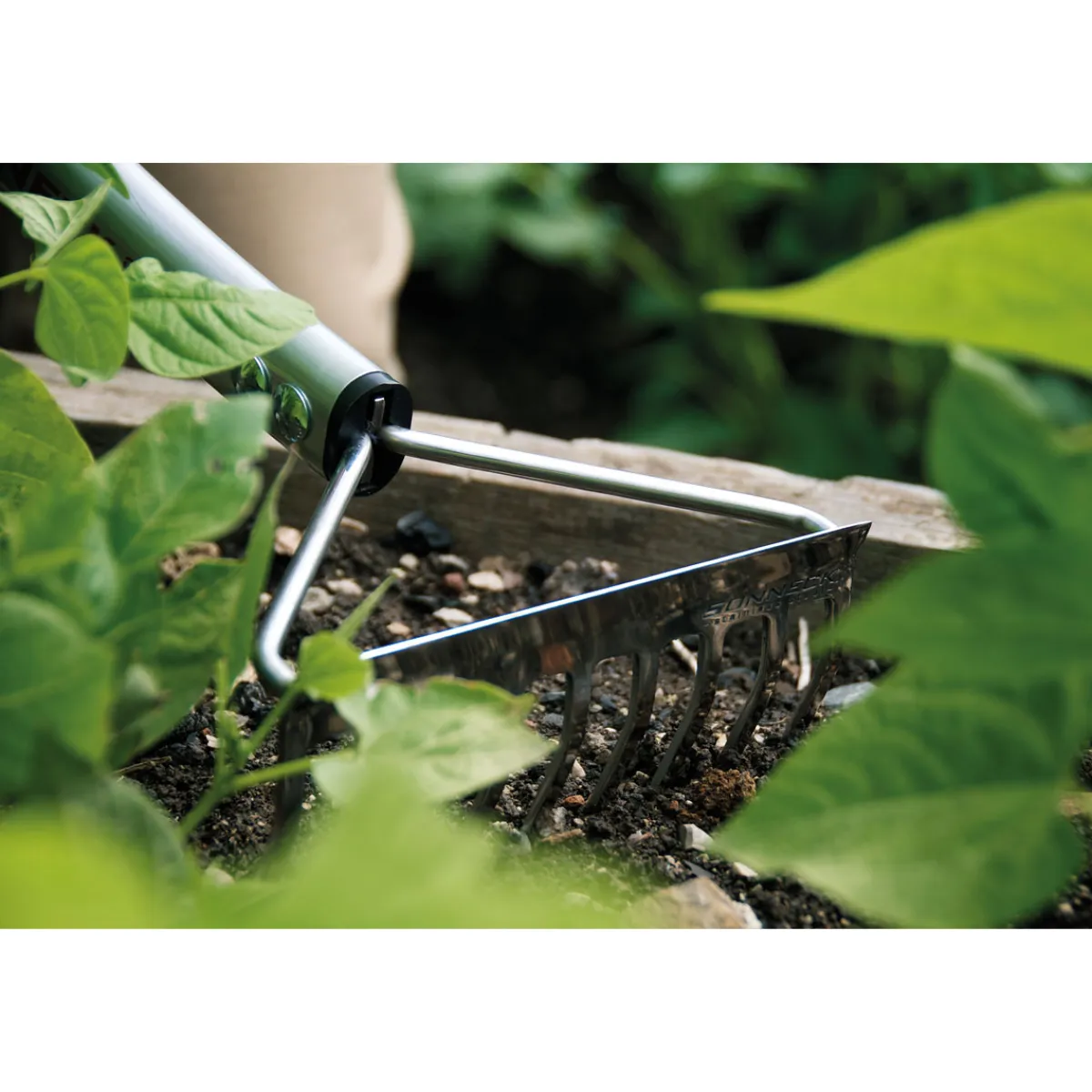 - Dank der gebogenen Zinken lässt sich der Boden mühelos auflockern und Unkraut entfernen.