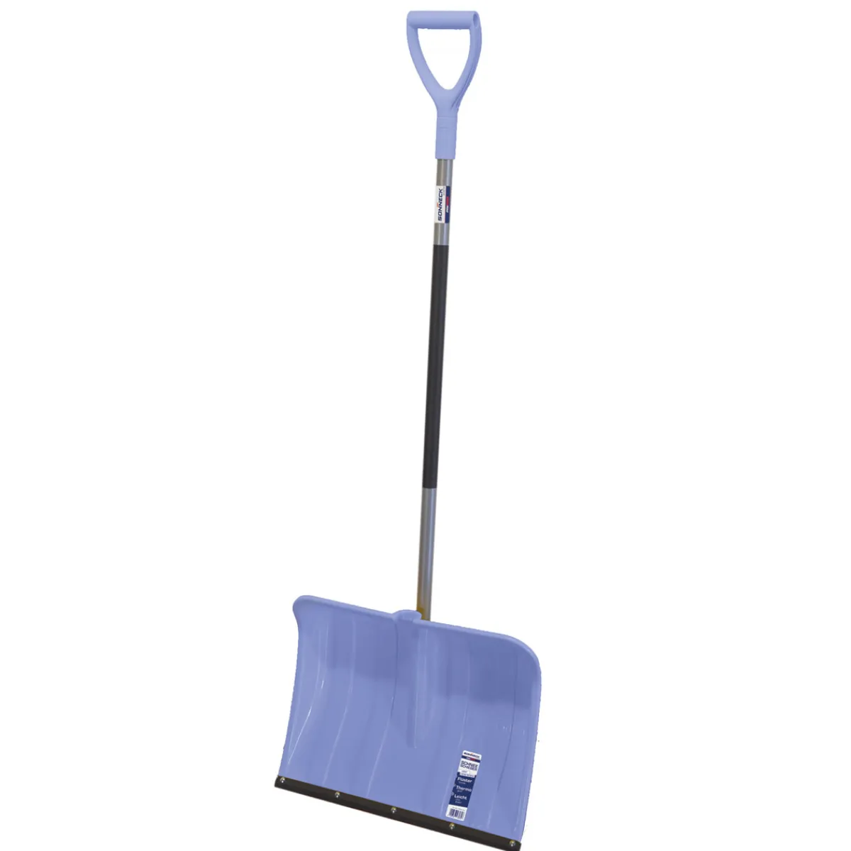 Hochwertiger Kunststoffschneeschieber in aktuellen Trendfarben mit Flüsterkante, die besonders leises Schneeräumen ermöglicht, selbst auf Kopfsteinpflaster.