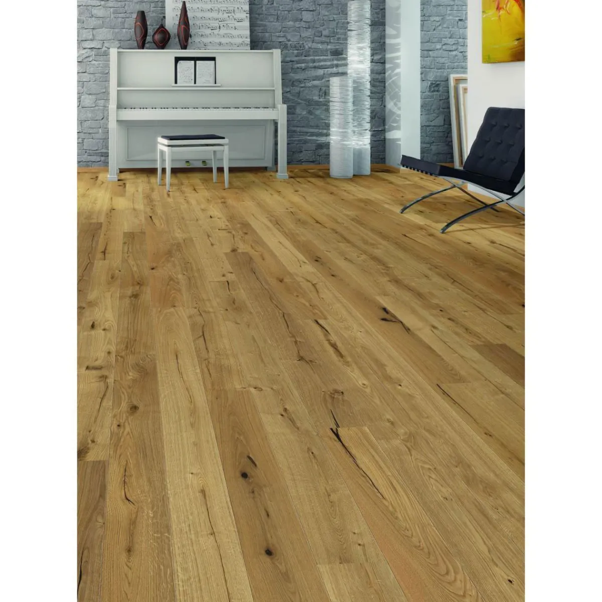 Ein beträchtlicherer Gewinn ist die Loc Connect-Verbindung. Mit ihr lässt sich der Belag auch ohne spezifische Handwerkerkenntnisse einfach verlegen. Die strukturiert geölte Oberfläche hat ein Dekor im Eiche-Stil. Durch die zweiseitige Mikrofase enstehen schmale Fugen zwischen den Bodenelementen, die dem Raum mehr Tiefe verleihen. Der Boden ist für den Einsatz mit einer Fußbodenheizung passend.