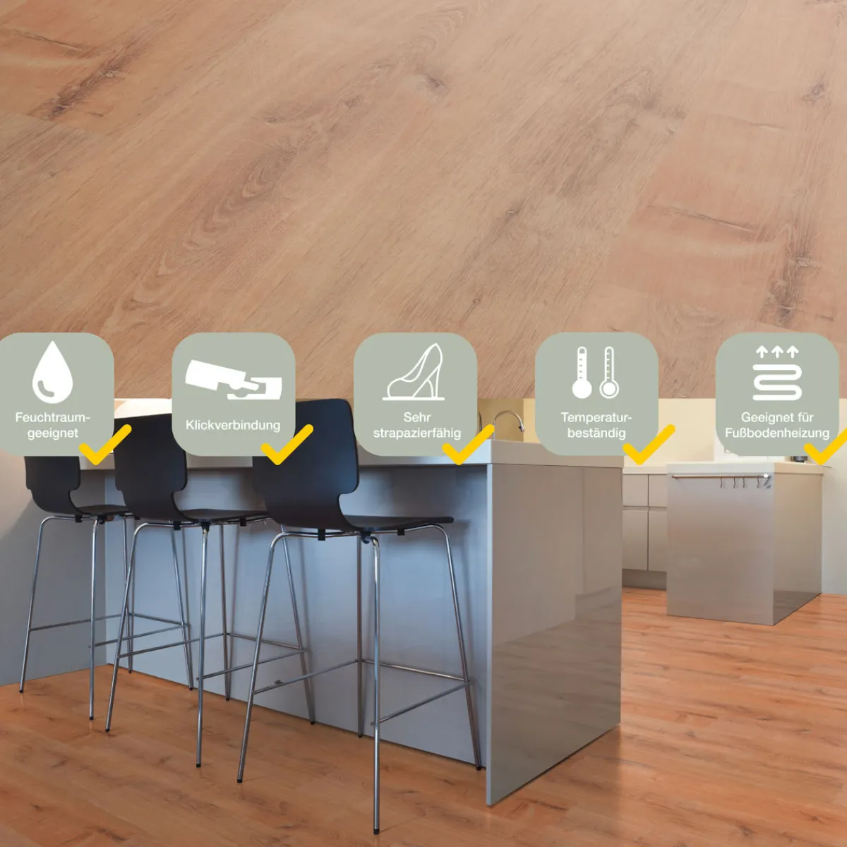 - Ideal für Feuchträume wie Badezimmer oder Küche dank seiner wasserresistenten Eigenschaften.