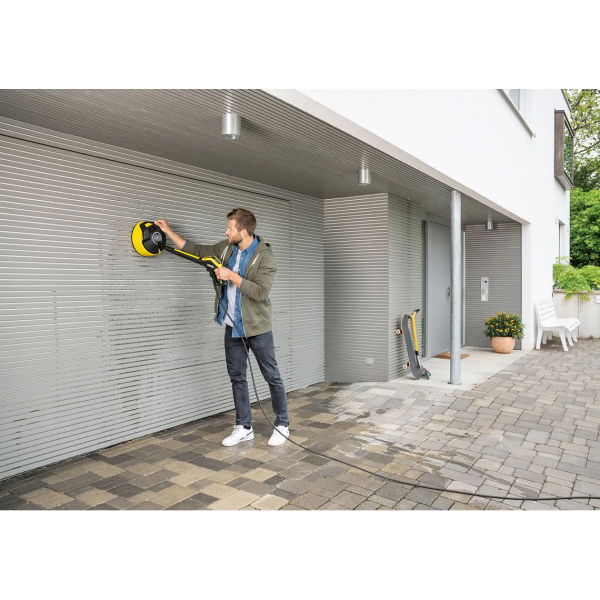 Der Flächenreiniger ist ideal für alleKunden, die größere Flächen im Garten oder auf Steinplatten reinigen möchten. Auch senkrechte Flächen lassen sich dank des ergonomischen Handgriffs bequem säubern.