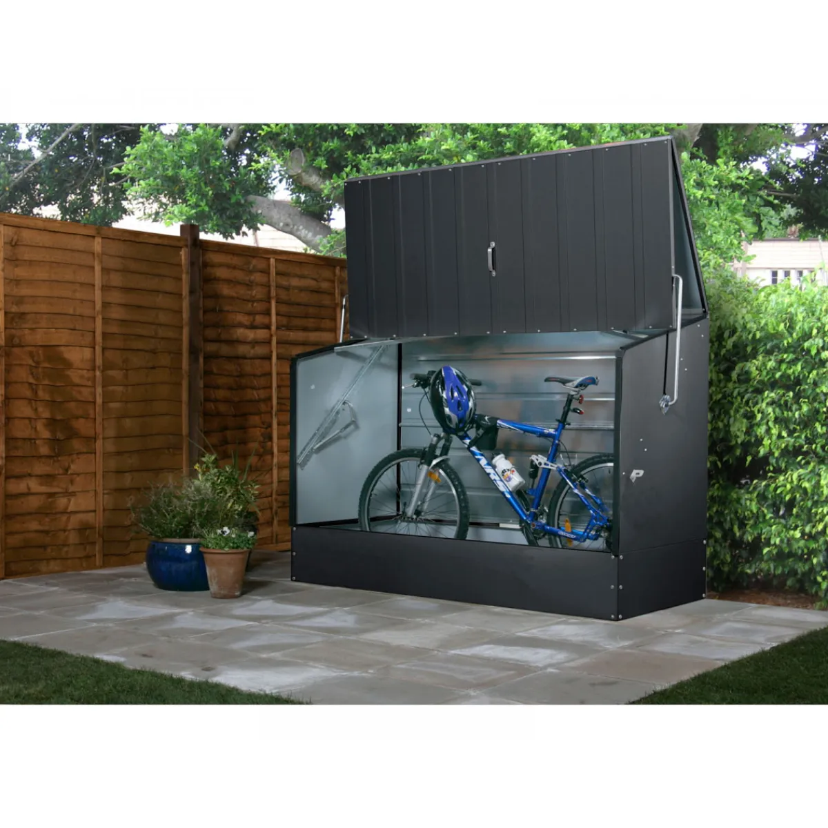Die Tepro Fahrradbox anthrazit ist die passende Lösung, um zwei bis drei Fahrräder bequem und sicher unterzustellen. Die Tepro Fahrradbox anthrazit ist aus galvanisiertem Stahl hergestellt, welcher zusätzlich noch grundiert und PVC-beschichtet ist. Dadurch ist diese Fahrradgarage absolut wetterfest und bietet zwei bis drei Fahrrädern einen ausreichenden Schutz. Die Materialstärke beträgt 0,65 bis 0,7 mm. Recht vorteilhaft für die Entnahme der Räder ist die großzügige Öffnung mit leichtgängigem Federzugsystem. Bei Bedarf können in der 196×89x133 cm großen Garage zwei Bügelschlösser fixiert werden. Diese müssen optional gekauft werden. Die Innenmaße der Tepro Box betragen 175×75,3x128,2 cm und sind für bis zu drei Rädern ausreichend dimensioniert. Die 64 kg schwere Box wird mit einer Bodenverankerung geliefert. Die Tepro Fahrradbox anthrazit überzeugt mit einer hochwertigen Verarbeitungsqualität und ist mit einer stabilen Bodenverankerung sowie einer praktischen Öffnung mit Federzugsystem ausgestattet.