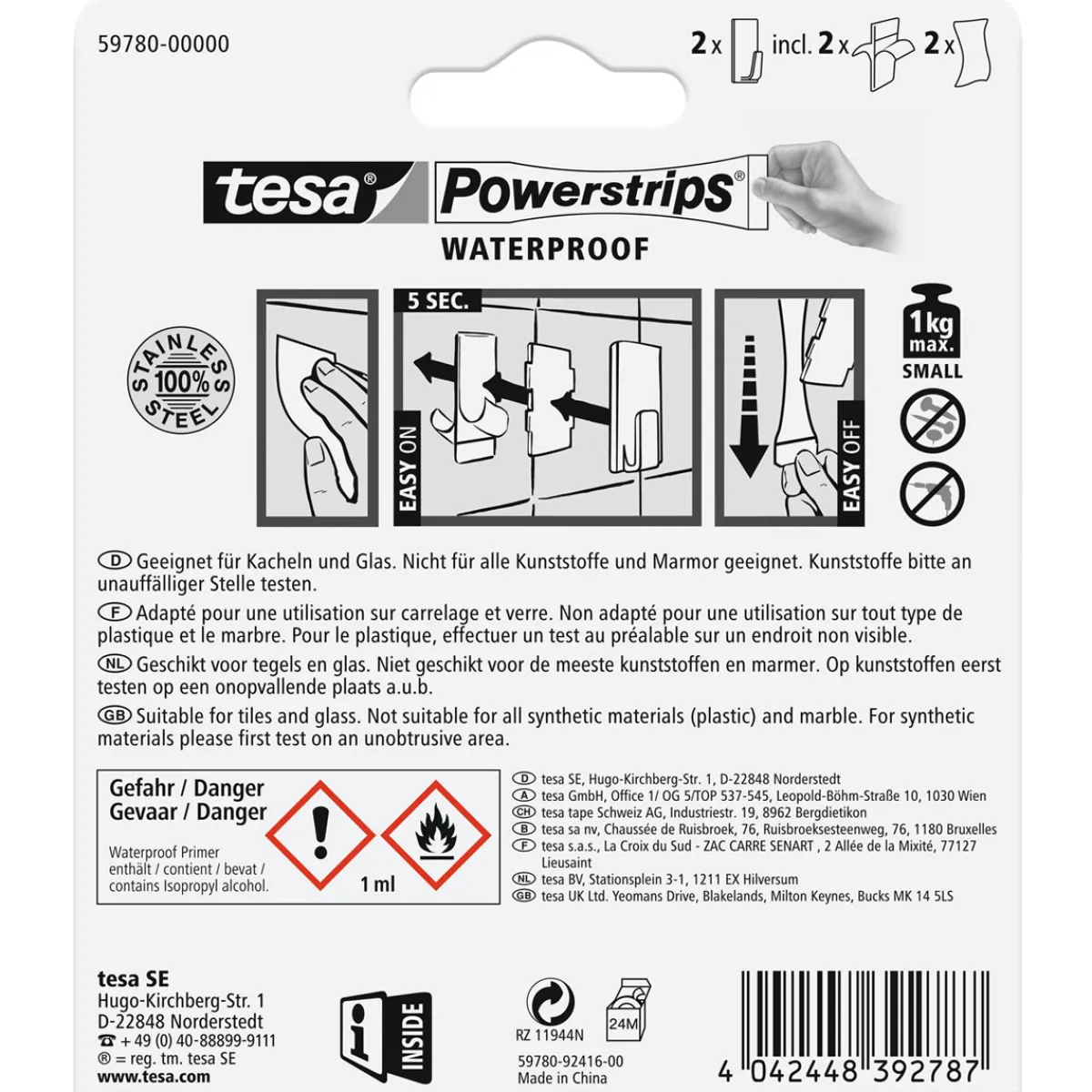 Mit den Tesa Powerstrips Waterproof Haken Small aus Edelstahl können Sie endlich auch in der Dusche oder im Bad Ihre Handtücher, Waschlappen und andere Gegenstände sicher aufhängen. Die einfache Montage ohne Bohren oder Schrauben macht die Verwendung besonders angenehm.