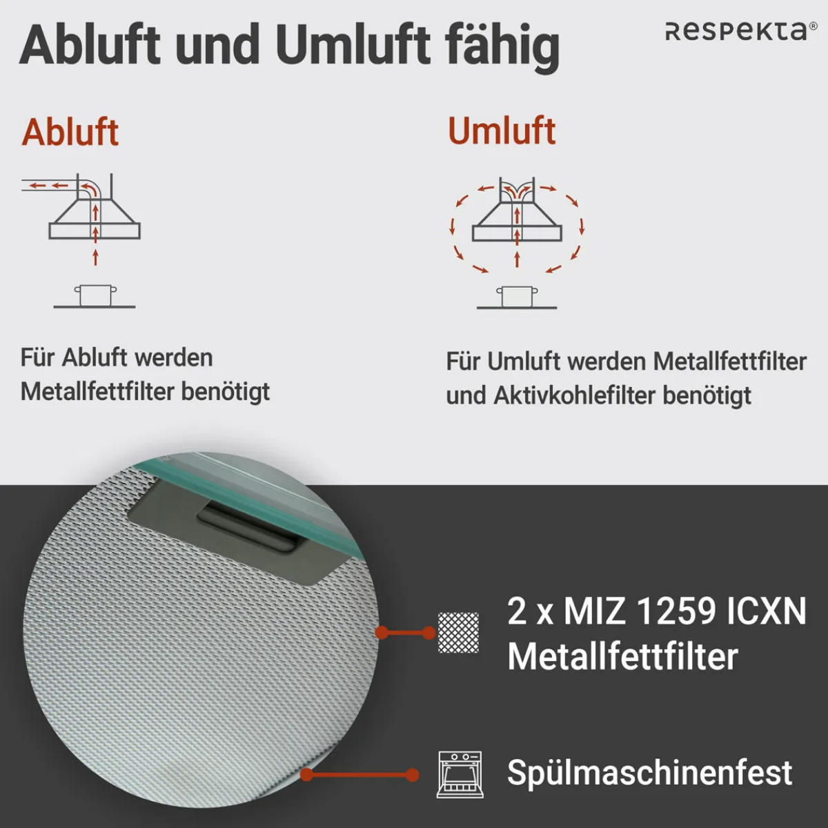 - – Filterart: Metallfilter mit Fettabscheidegradklasse E (56-65%)