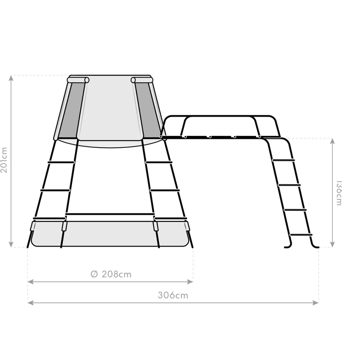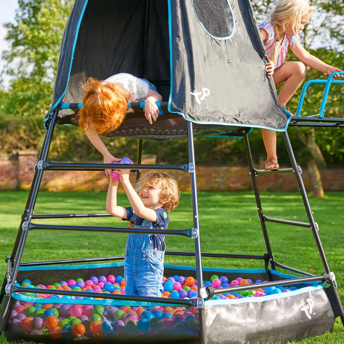 TP Toys Stahl Klettergerüst Explorer Schwarz 208x318x201 cm Spielturm, Klettergerüst & Spielhöhle – der Spielturm Explorer von TP Toys ist ein universelles Spielgerät und sorgt für abwechslungsreichen Spielspaß in deinem Garten! Klettern, toben und entspannen — der vielseitige Spielturm Explorer von TP Toys ist das perfekte Spielgerät für abenteuerlustige Kinder! Das Klettergerüst ist aus pulverbeschichtetem Stahl gefertigt, und somit optimal für den ganzjährigen Outdoorbetrieb geeignet. Die Füße der Konstruktion sind neigbar, und passen sich dem vorgegebenen Untergrund an. Der Spielturm lädt dein Kind zu mutigen Kletterpartien auf Klettergerüst und Affensteg ein, und rundet das Spielerlebnis mit dem großzügigen Spielzelt ab. Hier kann dein Kind der Kreativität bei fantasievollen Rollenspielen oder einem geheimen Picknick freien Lauf lassen. Der Boden des Spielzelts wird mittels stabiler Stoffschlaufen am Gestänge des Klettergerüsts befestigt, dadurch ist das Zelt fest und sicher mit dem Klettergerüst verbunden. Unterhalb des Zeltes kannst du eine vorgefertigte Fläche frei nach Kinderwunsch als Sandkasten oder Bällebad nutzen. Klettergerüst Spielturm: * Pulverbeschichteter Stahl * Klettergerüst mit Affensteg * Affensteg mit 2 Handläufen on Top * Spielgrube als Sandkasten oder Bällebad nutzbar * Verstellbare Füße für mehr Stabilität auf unebenem Boden * Abgerundete Kanten für hohe Sicherheit Spielzelt Höhle: * Robuster Polyester * Kindgerecht bedruckter Boden * Inkl. Fenster * Inkl. 2 Eingängen Allgemeine Besonderheiten: * Kapazität für 2 Kinder max. 100 kg * Nur für den Hausgebrauch * Geeignet für Kinder ab 3 Jahren * Geringer Wartungsaufwand