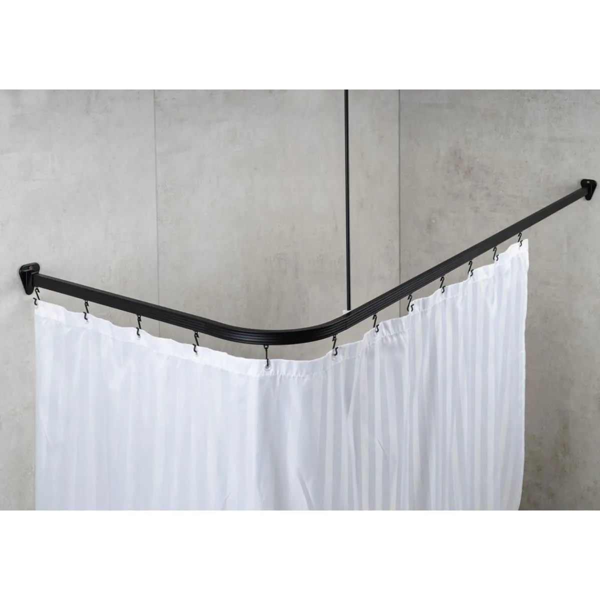 Die Schiene verfügt über innenliegende Gleiter und an den beiliegenden Haken kann der Duschvorhang problemlos befestigt werden. Somit vereint die Duschvorhangschiene Optik und Funktionalität.