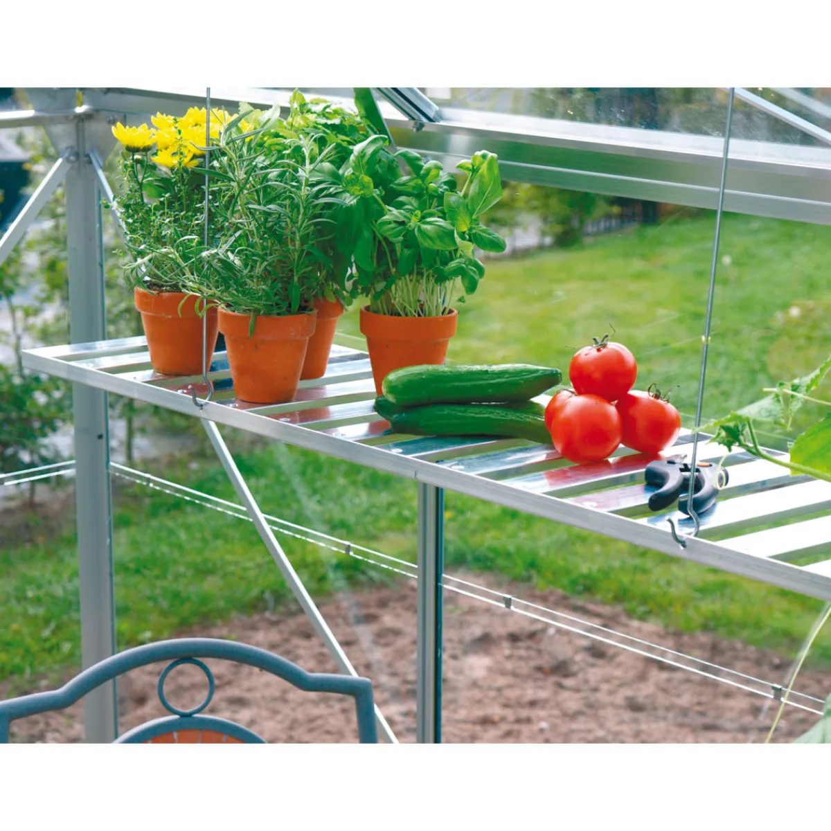 Das Vitavia Aluregal ist die perfekte Lösung für alle, die in ihrem Gewächshaus auf begrenztem Raum viel unterbringen möchten. Das abklappbare Regal aus eloxiertem Aluminium bietet nicht nur zusätzliche Ablagefläche, sondern schützt auch vor UV-Strahlung und Witterungseinflüssen.