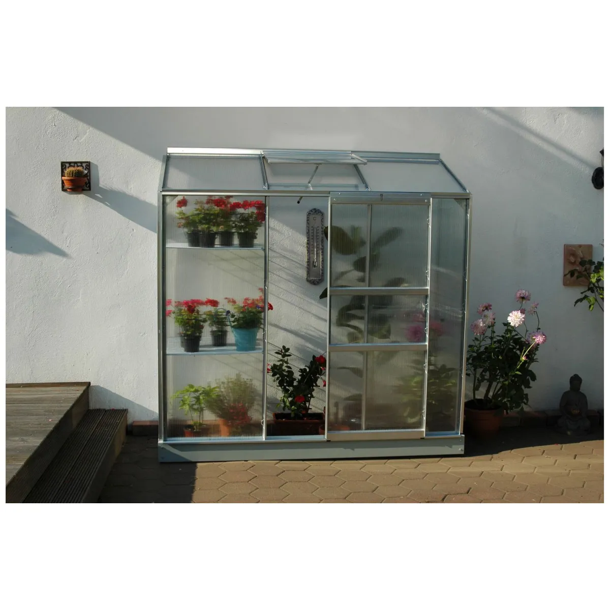 - – Traufhöhe von 152 cm und Firsthöhe von 182 cm bieten ausreichend Platz für hohe Pflanzen