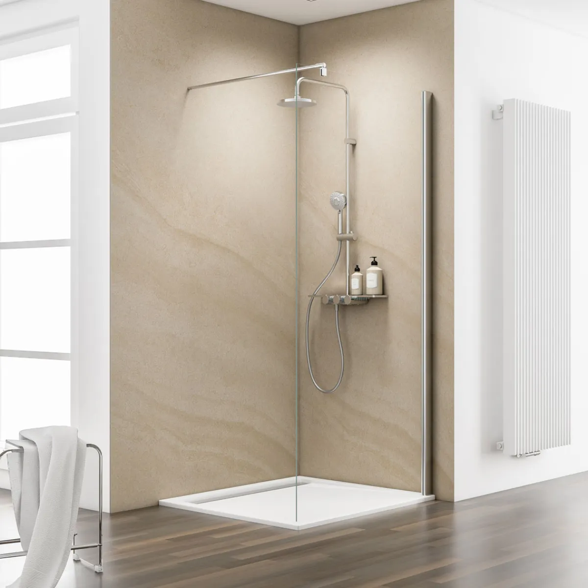 Die Walk In M6 der Serie MasterClass des Markenherstellers Schulte glänzt durch ihren eleganten, dezenten Look. Die großflächige Echtglasscheibe (ESG) punktet mit brillanter Transparenz, welche jedem Raum eine besondere Atmosphäre verleiht und ihn größer erscheinen lässt.Jedoch überzeugt die Duschabtrennung nicht nur optisch: Der Artikel punktet zudem als verlässlicher Spritzschutz und zeichnet sich durch seine einfache Reinigung aus.