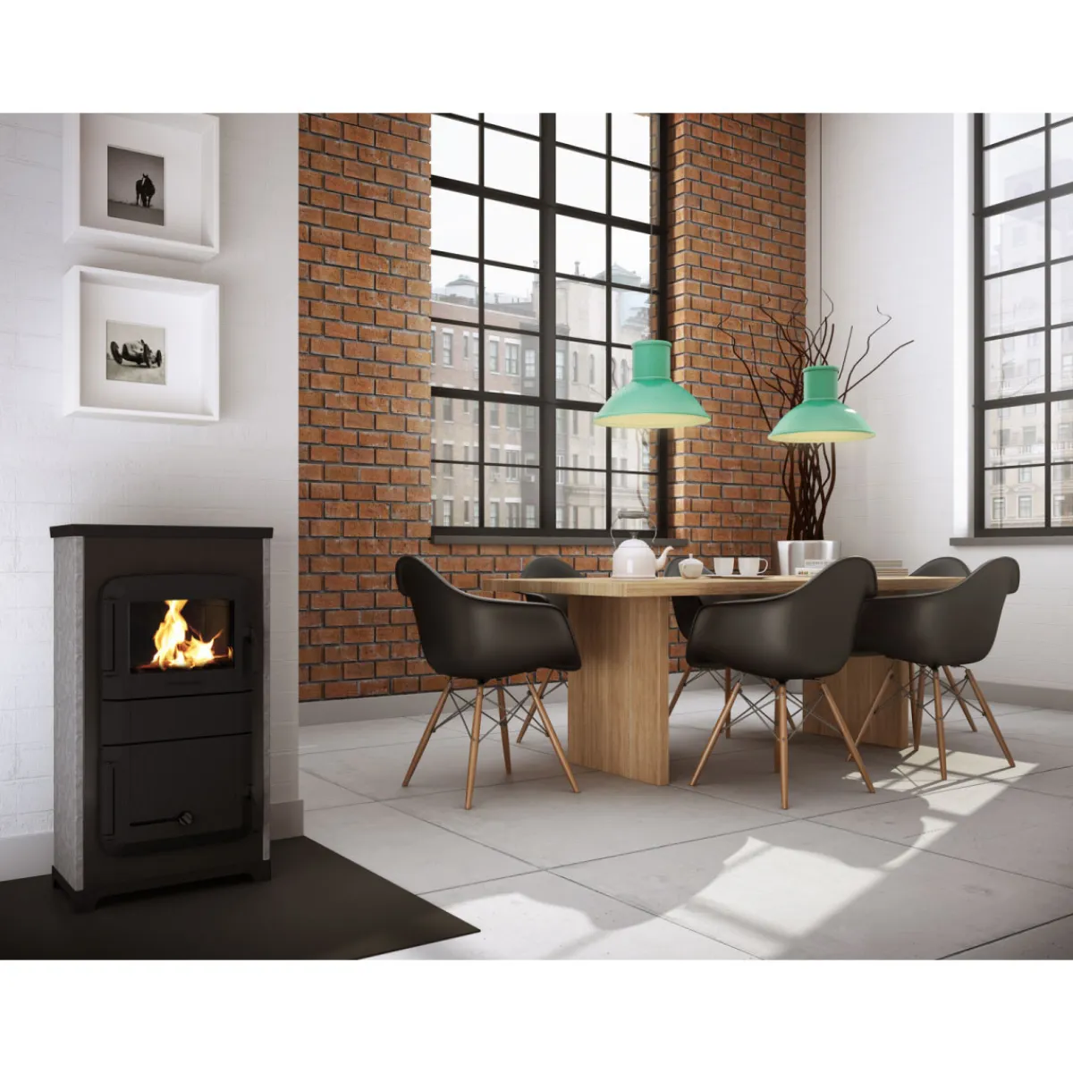 Mit der Verkleidung aus Granit verfügt der Ofen über eine hervorragende Wärmespeicherkapazität, ist widerstandsfähig, leicht zu reinigen und hält auch die darauf platzierte Teekanne herrlich warm. Fast wie Omas Ofen, nur in modischem Design und mit fortschrittlicher Technik. Passend ist das Modell für alle Räume, die 250 m³ messen oder kleiner sind. An diesem Ofen befindet sich der Anschluss für das Rohr hinten. Mit den Maßen von 52 cm x 98 cm x 33 cm (BxHxT) passt der Ofen unkompliziert in die meisten Zimmer.