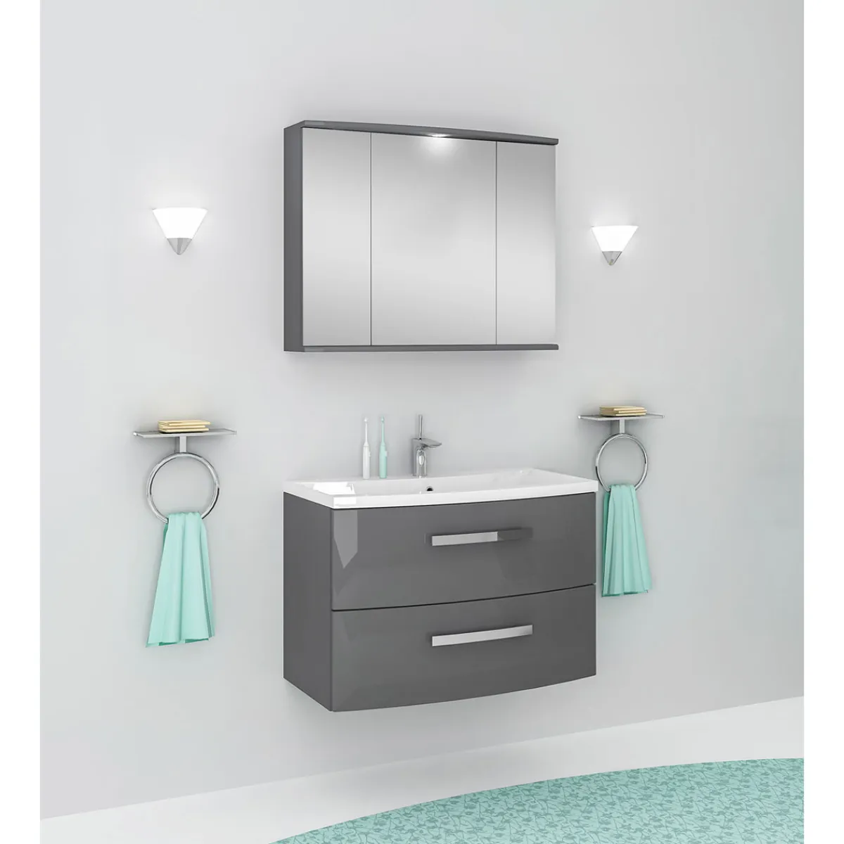 Mit dem Waschplatz-Set Olivia erhalten Sie ein hochwertiges Badmöbel-Set mit vielen praktischen Funktionen. Obwohl es nicht vormontiert ist, lässt es sich leicht zusammenbauen. Die schwarze Grundfarbe verleiht Ihrem Badezimmer eine elegante Note. Der Spiegelschrank bietet ausreichend Stauraum für Ihre Pflegeprodukte und Accessoires. Wenn Sie auf der Suche nach einem funktionalen Badmöbel-Set sind, das auch optisch überzeugt, dann ist das Waschplatz-Set Olivia die richtige Wahl.