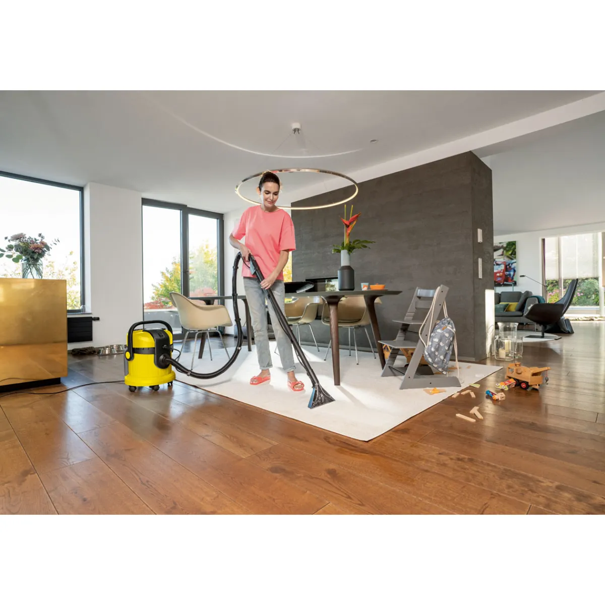 Fasertiefe Reinigung trifft auf ergonomischen Komfort und Multifunktionalität: Der Waschsauger SE 4004 im attraktiven Schlittendesign sorgt für fasertiefe, hygienische Sauberkeit auf vielen textilen Oberflächen. Die bewährte Kärcher Sprühextraktions-Technologie bietet beste Reinigungsergebnisse: Frisches Leitungswasser und der Kärcher Teppichreiniger RM 519 werden mit Druck tief in die textilen Flächen eingesprüht und zusammen mit dem gelösten Schmutz wieder abgesaugt – ideal geeignet für Familien, Allergiker und Haushalte mit Tieren. Als multifunktionales 3-in-1-Produkt kann das Gerät auch als vollwertiger Nass-/Trockensauger eingesetzt werden. Der große, lichtdurchlässige 4-Liter-Frischwassertank ist stoßfest und abnehmbar, wodurch das Befüllen und Entleeren erleichtert wird. Das aufgesaugte Schmutzwasser wird im Gerätebehälter gesammelt. Der 3-in-1-Bügelgriff ermöglicht ein komfortables Tragen, Öffnen, Schließen und Entleeren des Behälters. Das mitgelieferte Zubehör kann ordentlich am Gerät verstaut werden. Nach der Anwendung lässt sich das Gerät einfach reinigen für eine lange Produktlebensdauer.