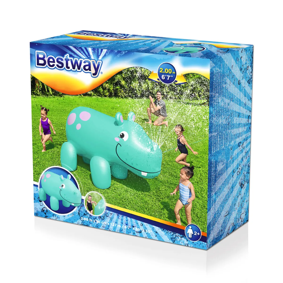 Das Wassersprinkler „Hippo“ hat aufgeblasen die Maße BxHxT 200x96x127 cm. Er hat im Lieferumfang einen Gartenschlauchanschluss und einen Reparaturflicken. Der Sprinkler ist für Kinder ab 2 Jahren geeignet.