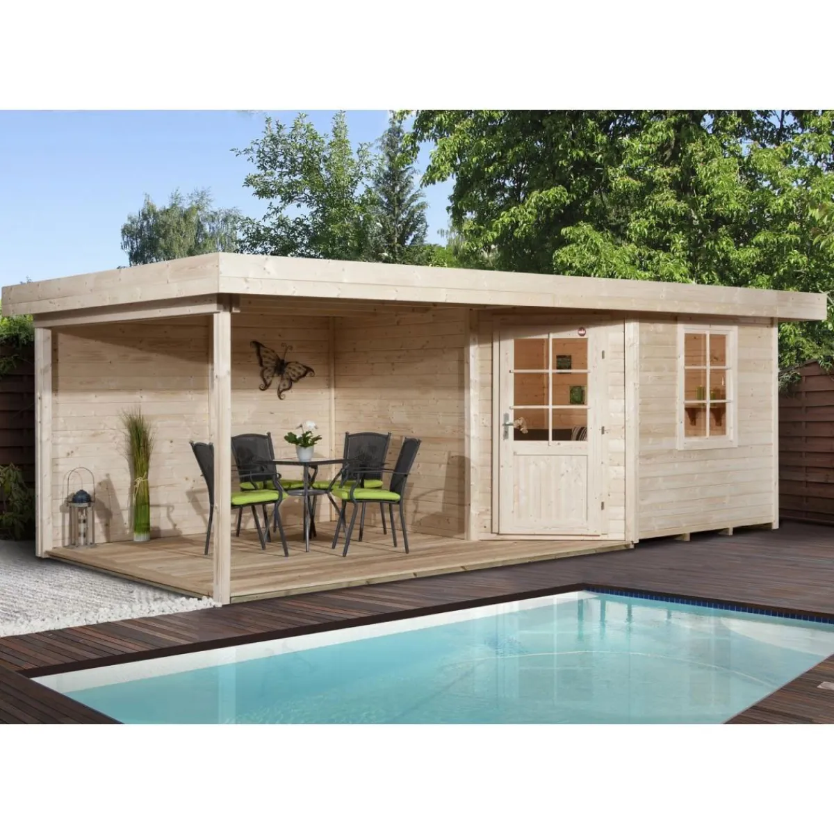 Das Weka Designhaus 213 B mit Anbau ist ein modernes und geräumiges Gartenhaus, das höchsten Ansprüchen gerecht wird. Mit einer Grundfläche von fast 18 m² bietet es ausreichend Platz für Gartengeräte, Werkzeug oder als gemütlicher Rückzugsort im Grünen.