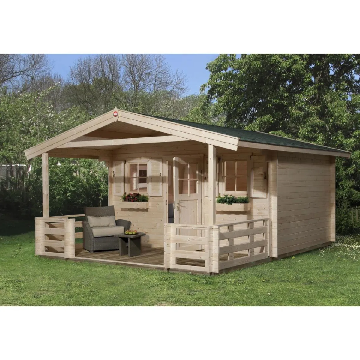 - Dachart: Satteldach mit Massivholzdach