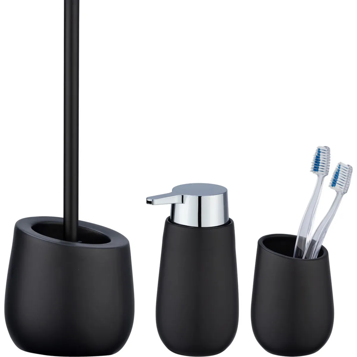 Verleihen Sie Ihrem Badezimmer eine moderne Eleganz mit dem zeitlos schönen Bad-Accessoire-Set Badi aus hochwertiger Keramik. Die klassische schwarze Farbe und matte Oberfläche machen die Accessoires zu einem Blickfang in jedem Badezimmer und Gäste-WC.