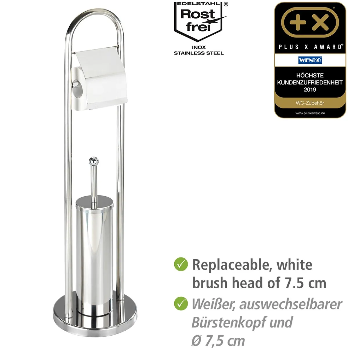 - Lieferumfang inklusive einer WC-Bürste mit auswechselbarem weißen Bürstenkopf von Ø 7,5 cm und einem Edelstahl-Stiel.