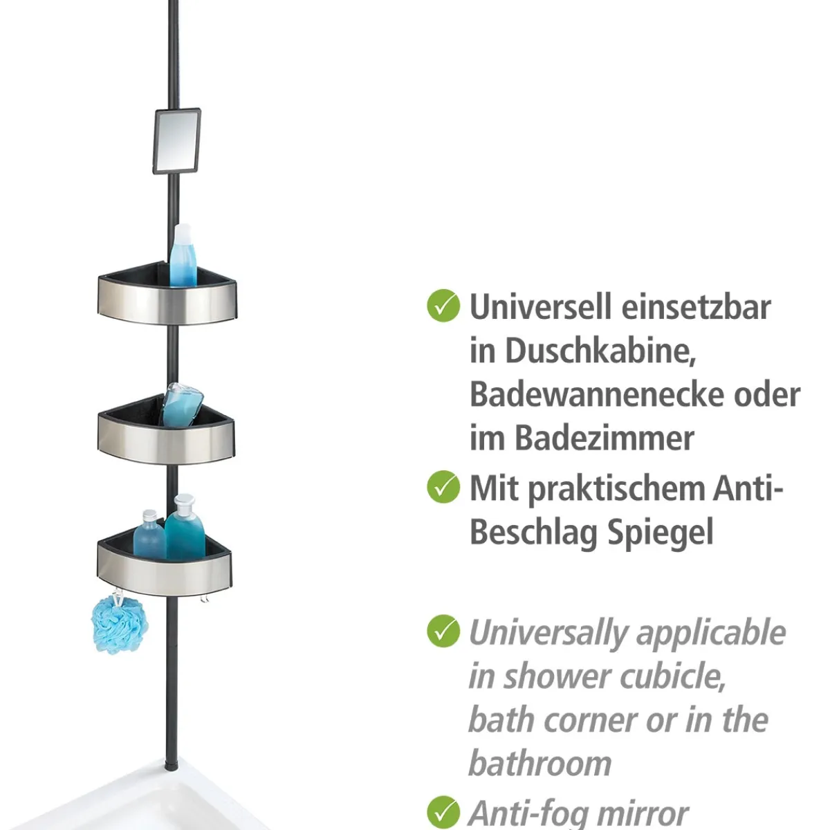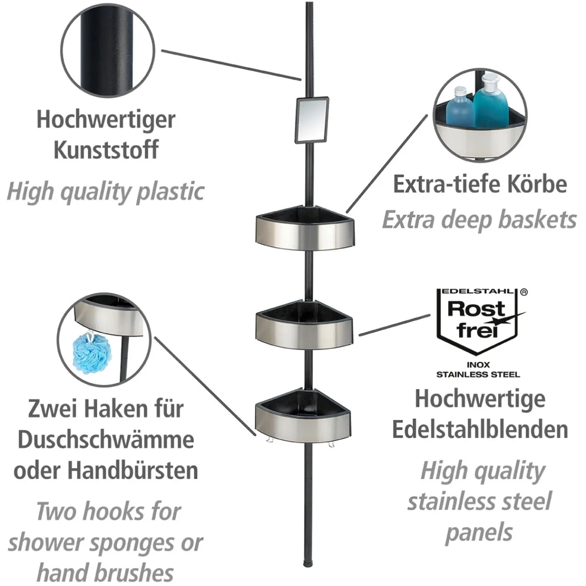 Mit der Wenko Teleskop-Duschecke Premium Big Black Edelstahl rostfrei holen Sie sich ein platzsparendes und höhenverstellbares Bad-Regal ins Badezimmer. Die Duschecke bietet mit drei Ablagen, einem Spiegel und zwei Haken ausreichend Platz für Ihre Pflegeprodukte und Handtücher.