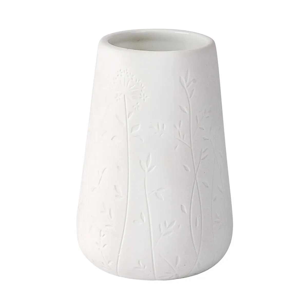 - Weißer Keramik-Zahnputzbecher mit zartem Blümchen-Relief