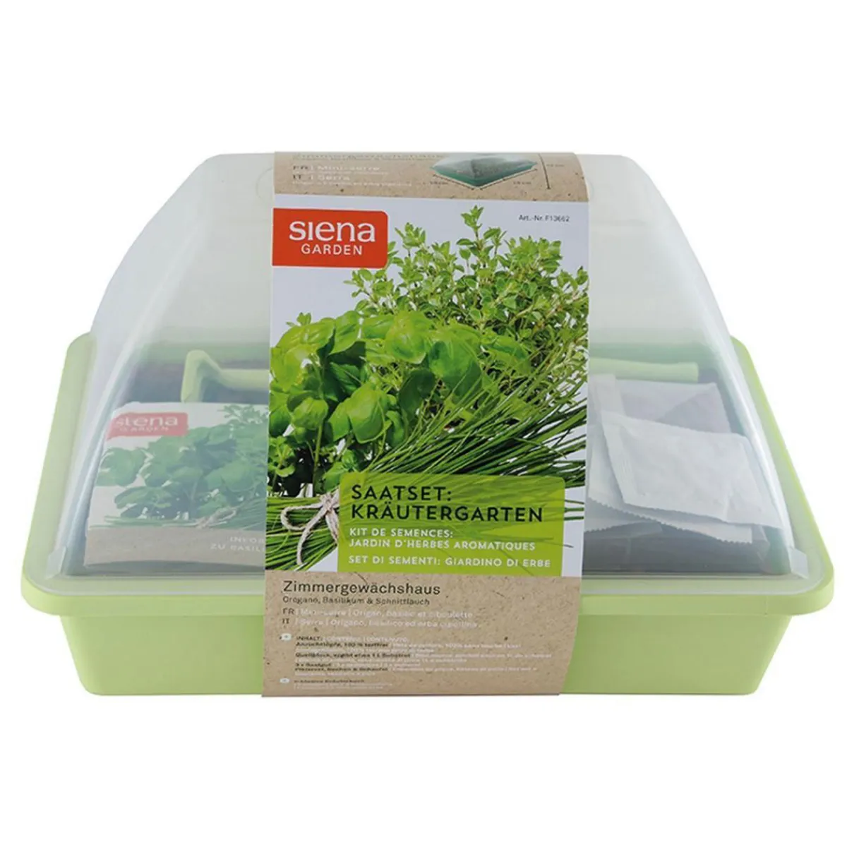 Mit dem Siena Garden Zimmer-Gewächshaus-Set inklusive Kräutersaat können Sie Ihre eigenen Pflanzen und Kräuter im Haus züchten. Das kompakte Gewächshaus ist ideal für kleine Räume und bietet den perfekten Start in die Welt des Indoor-Gärtnerns.