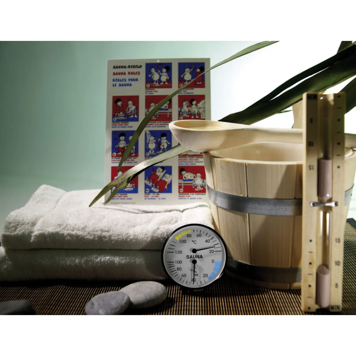 - Lieferumfang: inkl. Klimamesser, Sanduhr, Schöpfkelle, Aufgusseimer 3 Liter, Kunststoffeinsatz für Eimer, Baderegeltafel