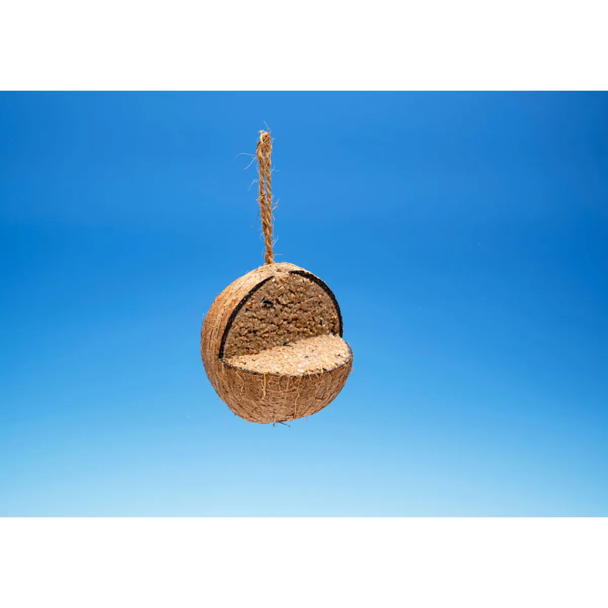 3/4 Kokosnuss zum Aufhängen, gefüllt mit Insektenfett und ölhaltigen Samen.