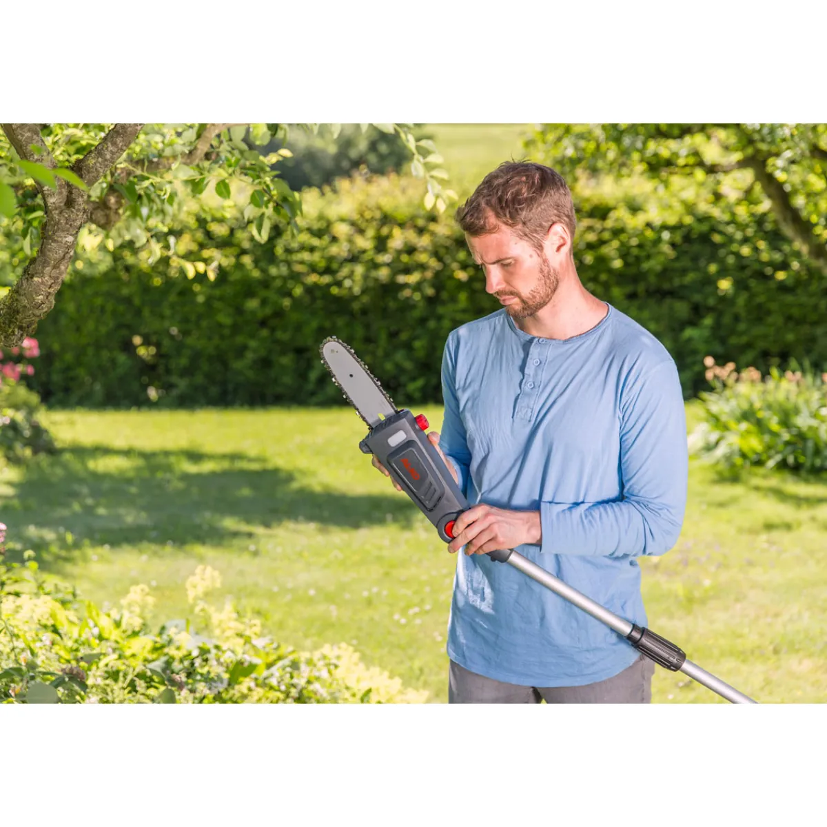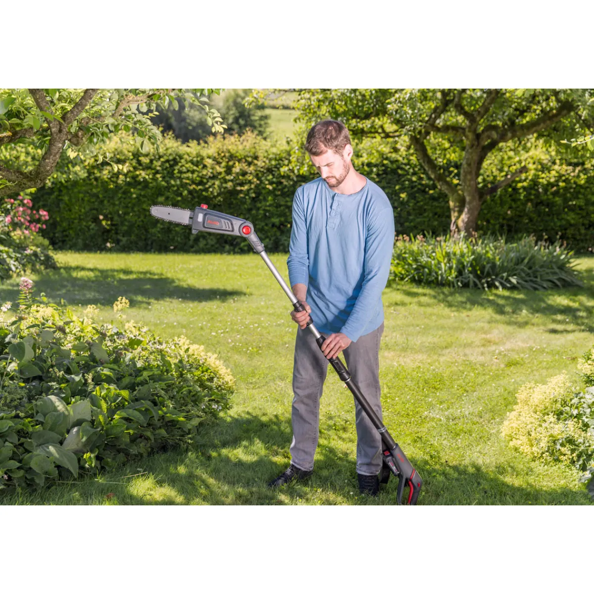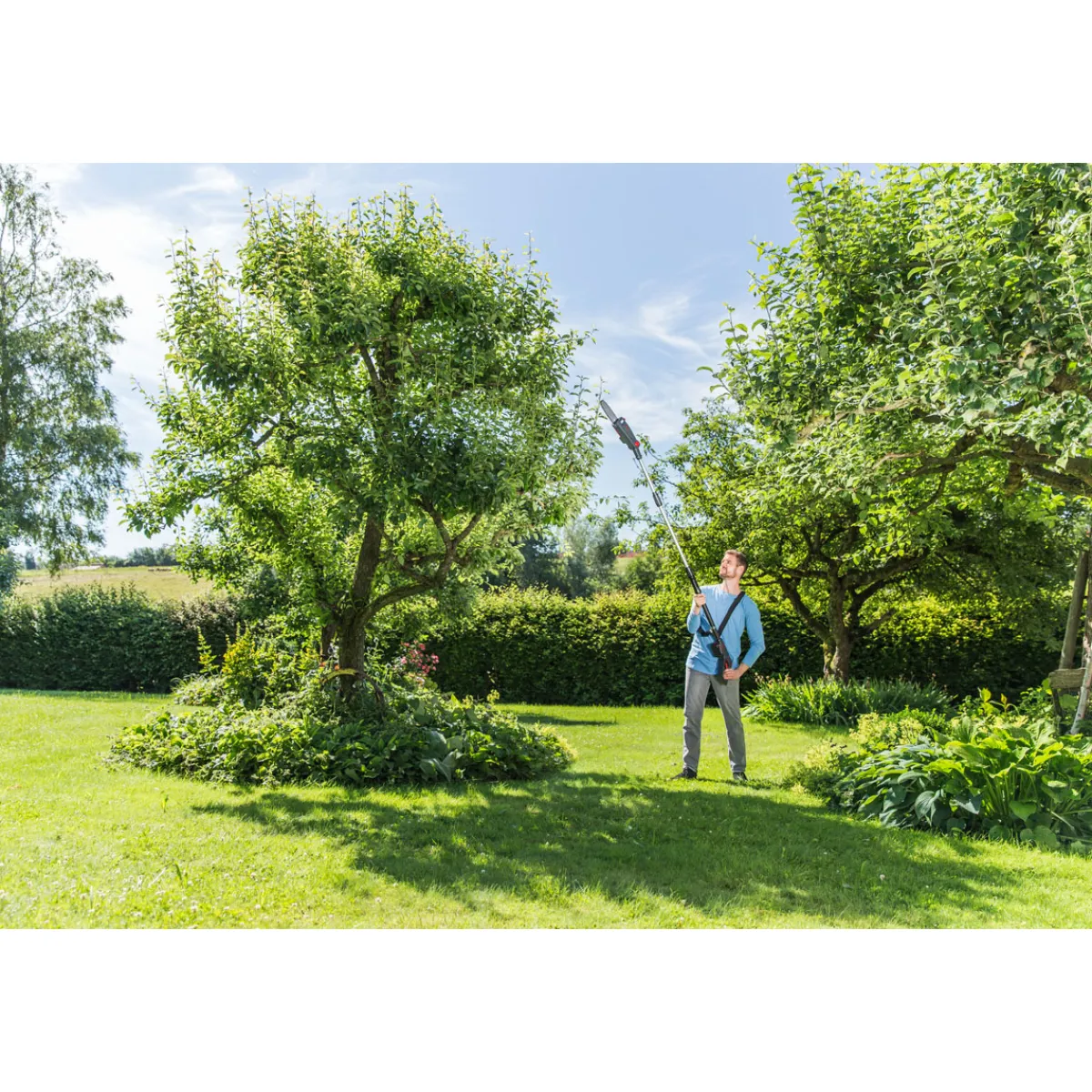 Mit dem AL-KO Akku-Hochentaster 18 V CSA 1820 wird das Schneiden von Ästen und Zweigen im Garten zum Kinderspiel. Dank der hochwertigen Oregon Schwert- und Kettenmarke sowie der leistungsstarken Li-Ion-Akkutechnik ist das Gerät besonders robust und zuverlässig. Mit einer Schnittgeschwindigkeit von 3,7 m/s und einem Schalldruckpegel von nur 73 dB ist der Hochentaster zudem äußerst effizient und angenehm leise.