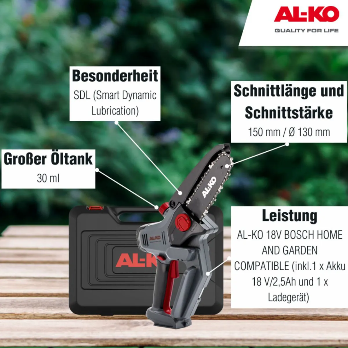 Die AL-KO Akku-Kettensäge eignet sich ideal für alle Kunden, die eine leichte und handliche Kettensäge suchen, die dennoch kraftvoll genug für das Entasten von Bäumen und das Schneiden von Ästen ist. Durch den emissionsarmen Li-Ionen-Akku ist sie zudem umweltfreundlich.