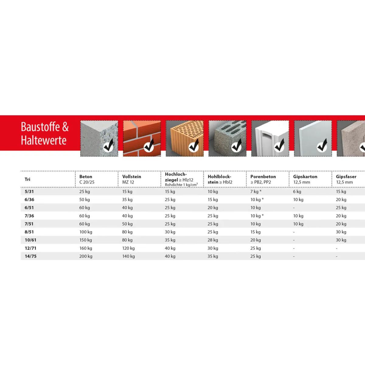 - – Geeignet für: Mauerwerk, Beton, Vollstein, Hochlochziegel, Porenbeton und Gipskartonplatte.