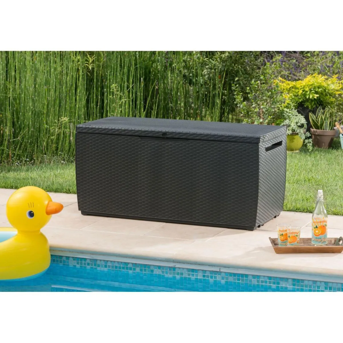 Mit der Keter Aufbewahrungsbox Rattan Style Box Capri haben Sie die Möglichkeit, Ihre Gartenutensilien stilvoll und sicher aufzubewahren. Die Box ist in einer eleganten Rattanoptik gehalten und bietet ein Fassungsvermögen von 305 Litern. Dank ihrer Wetter- und UV-Beständigkeit können Sie die Box das ganze Jahr über im Freien stehen lassen.