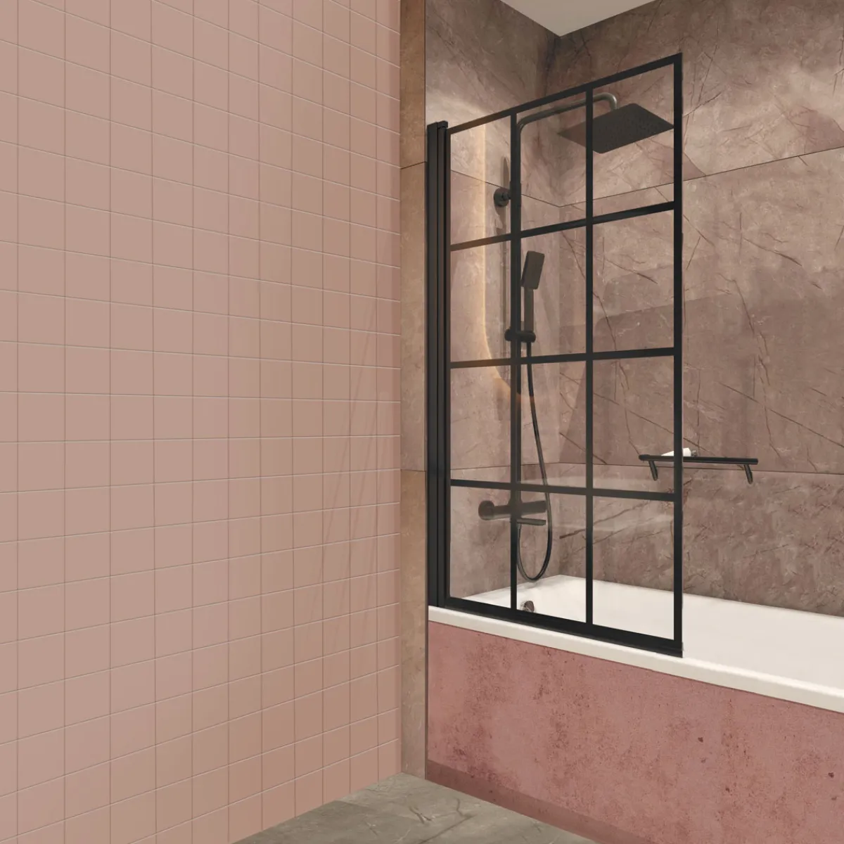 BxH 78×140 cm, Sicherheitsglas 5 mm, Klarglas mit Loft-Design, schwenkbar, Profilsystem ermöglicht die Krümmung von Wänden auszugleichen, mit Active-Cover-Beschichtung, die das Abperlen von Wasser erleichtert.