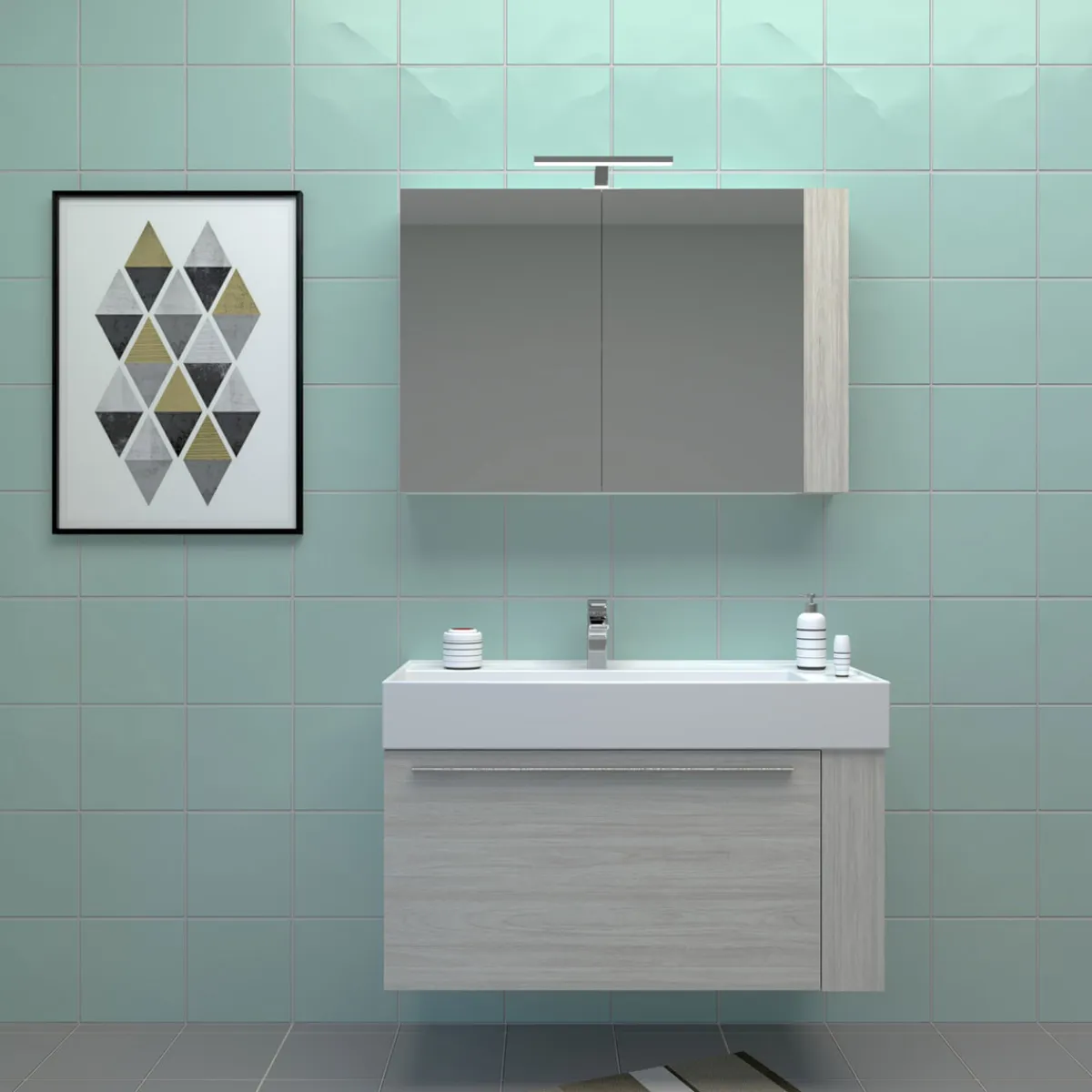 Erleben Sie das ultimative Badezimmererlebnis mit dem Progetto Idea Stella Badmöbel DOMUS 100 in Ulme Creme. Dieses Set besteht aus einem Spiegelschrank, einer Lampe und einem Waschbecken und bietet Ihnen alles, was Sie für ein modernes Badezimmer benötigen.