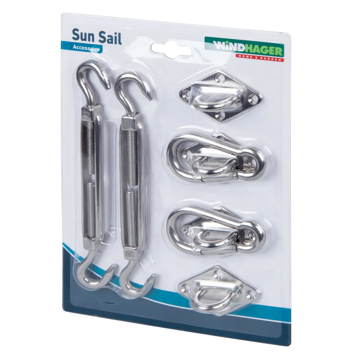 Mit dem Windhager Befestigungsset für Sonnensegel können Sie Ihr Sonnensegel sicher und stabil montieren. Das Set besteht aus 2 Spannankern, 2 Karabinerhaken und 4 Halteösen aus Edelstahl.