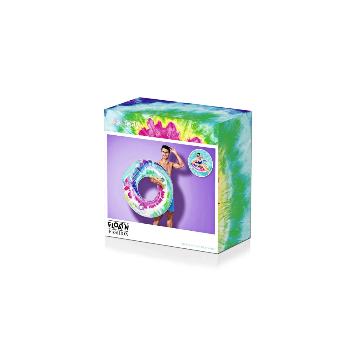 Der Schwimmring hat aufgeblasen die Maße Durchmesser 104 cm und Höhe 57 cm. Er besteht aus strapazierfähigem PVC und ist für eine Person geeignet. Der Schwimmring hat eine komfortable Kopfstütze, robuste Haltegriffe und Sicherheitsventile. Im Lieferumfang ist ein Reparaturflicken enthalten.