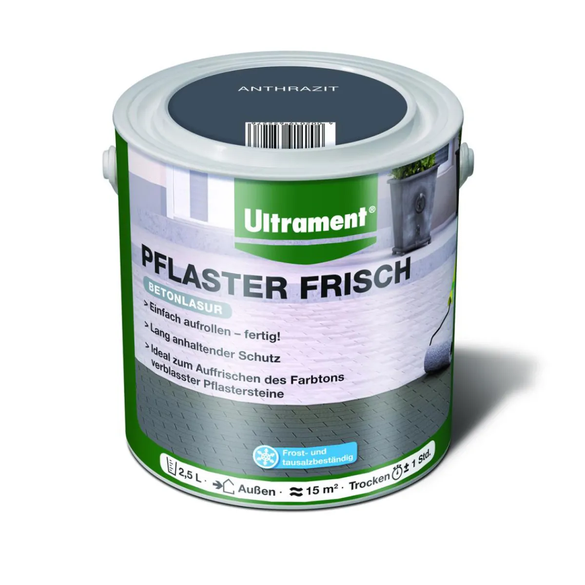 Die Ultrament Betonlasur Pflaster Frisch anthrazit 2,5 L eignet sich ideal für Kunden, die ihre Außenbereiche pflegen und optisch aufwerten möchten. Insbesondere für Besitzer von Betonpflastersteinen oder saugfähigem Beton bietet dieses Produkt eine einfache Möglichkeit zur Verschönerung.