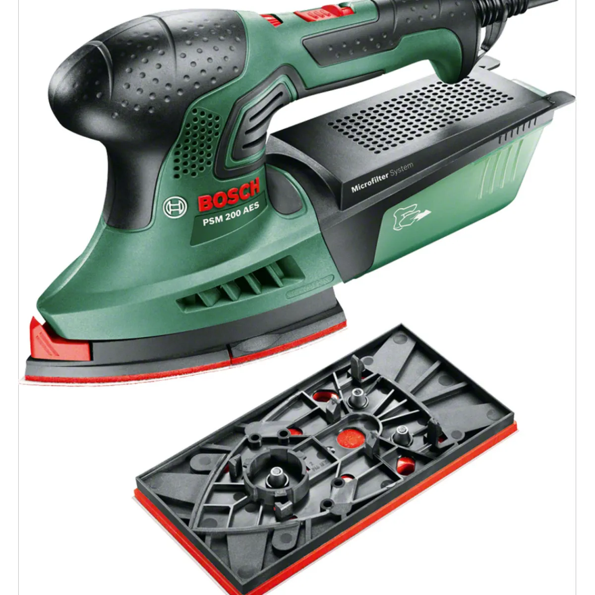 - Ausstattung: Mikroklettsystem, Integrierte Staubabsaugung, Bosch Microfilter System