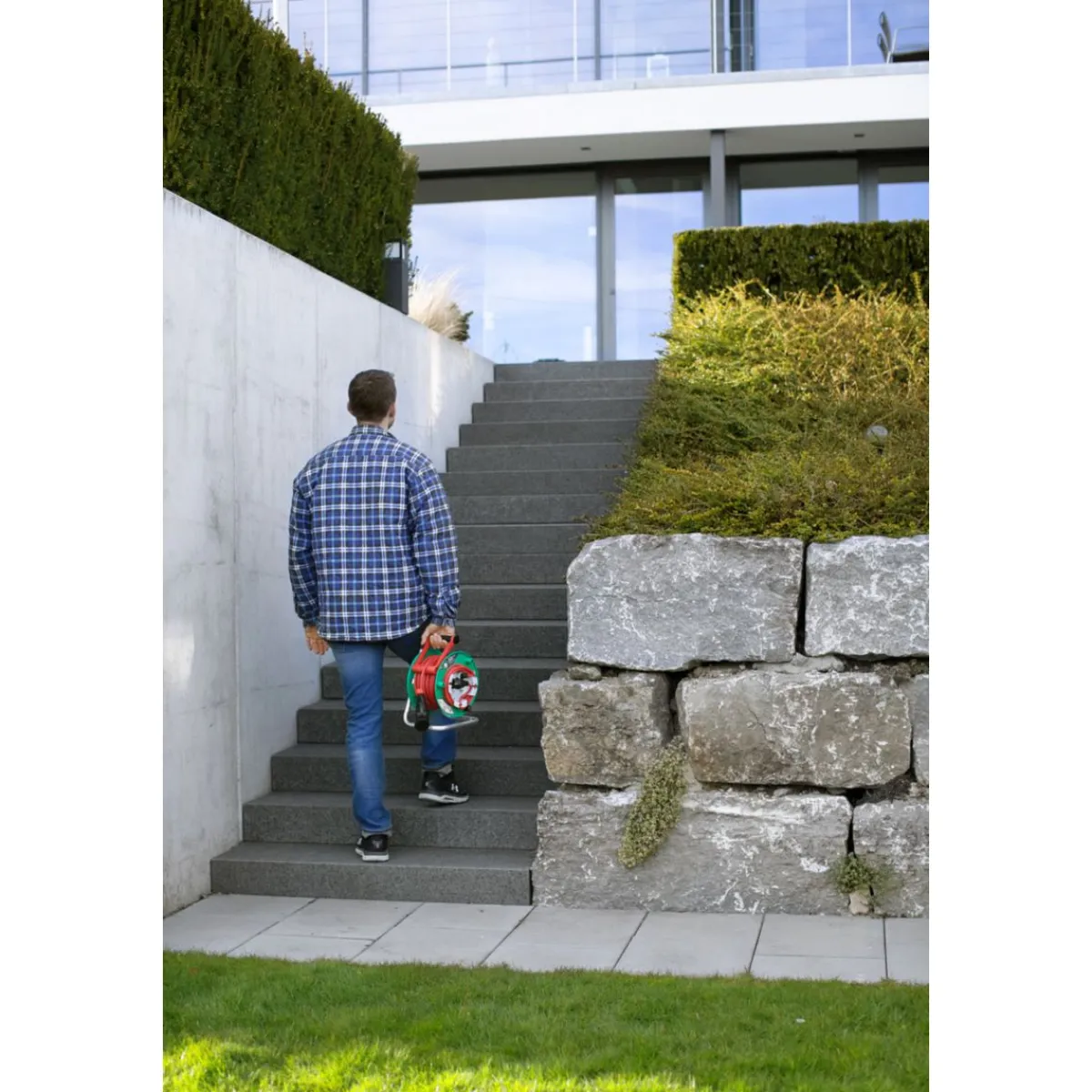 - Ergonomischer Handgriff mit Achse für perfekte Kabelführung beim Auf- und Abrollen.