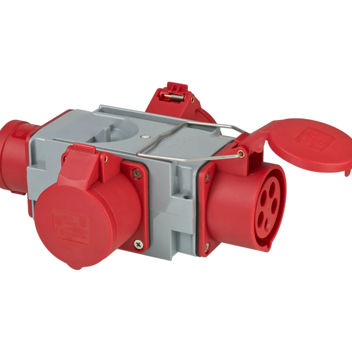 - Der Stromverteiler bietet ausgangsseitig genug Platz für drei 400V Anschlüsse
