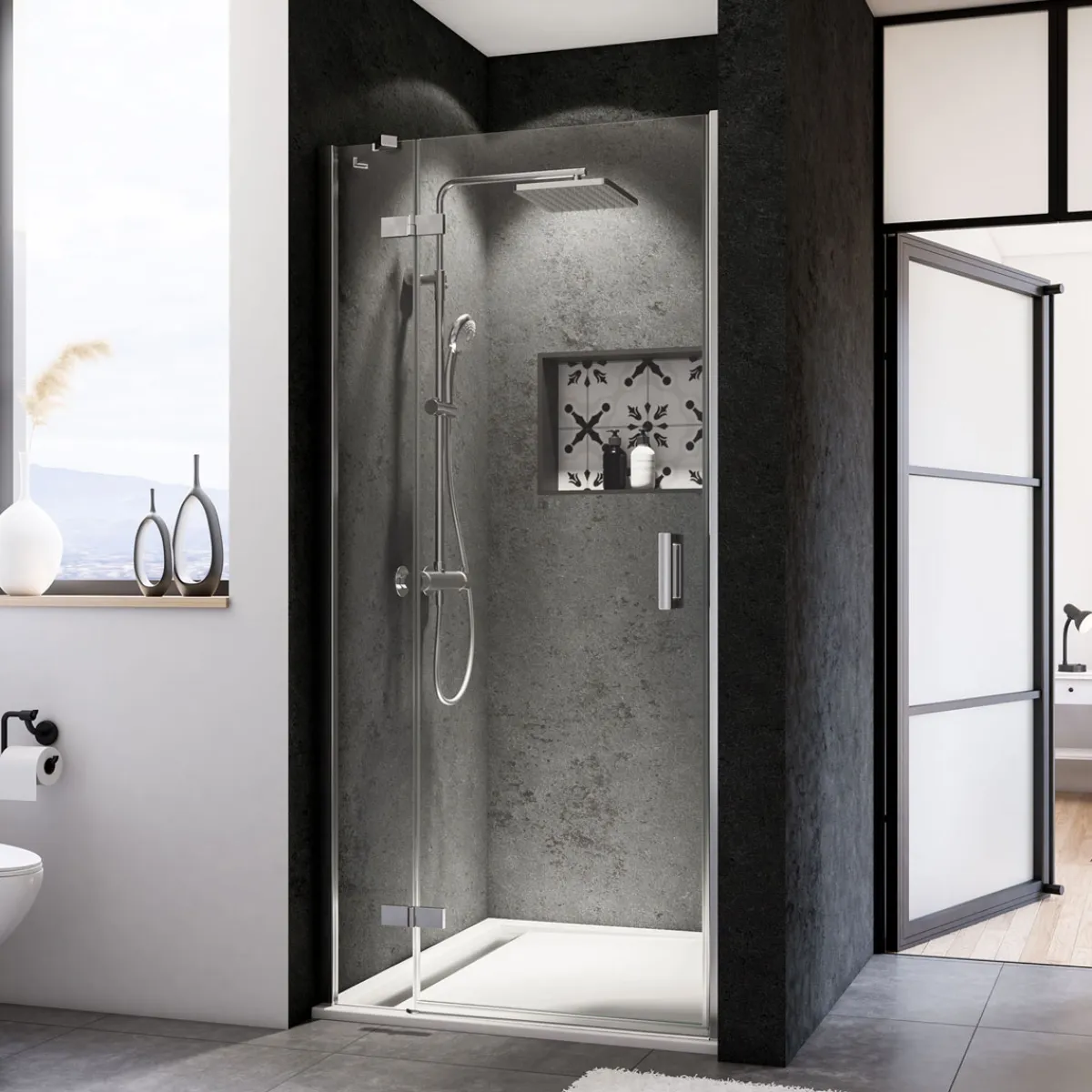 Die Breuer Drehtür mit Festteil Panorama in Schwarz Matt und Intima Glasdesign bietet nicht nur ein modernes Aussehen, sondern auch höchste Funktionalität. Mit ihrem Hebe-Senkmechanismus ermöglicht sie einen einfachen Ein- und Ausstieg in Ihre bodenebene Duschlösung. Die Tür ist aus hochwertigem Sicherheitsglas gefertigt und das Profil besteht aus robustem Aluminium. Die schwarze Farbauswahl verleiht Ihrem Badezimmer einen eleganten Touch. Wenn Sie nach einer stilvollen Lösung suchen, um Ihre neue oder bestehende bodenebene Duschlösung zu vervollständigen, dann ist die Breuer Drehtür definitiv eine Überlegung wert.