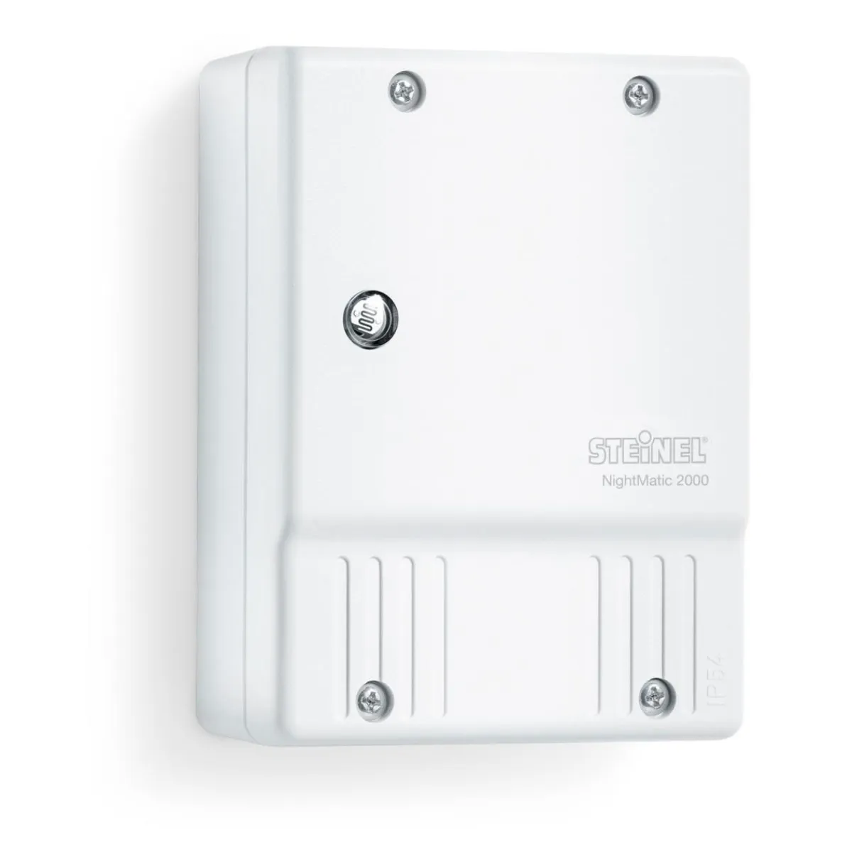 Automatische Beleuchtung. Dämmerungsschalter NightMatic 2000, zur Steuerung von Beleuchtungsanlagen für Hausfronten, Grundstücke, Schaufenster und ähnliches, schaltet bei Dämmerung automatisch Licht AN und am Morgen automatisch wieder AUS. Der Dämmerungsschalter ist mit der Schutzklasse II ausgestattet. Das Material ist ein UV-beständiger Kunststoff.Die Montage findet an der Wand statt. Der Netzanschluss des Dämmerungsschalters beträgt 230-240 V bei 50 Hz.