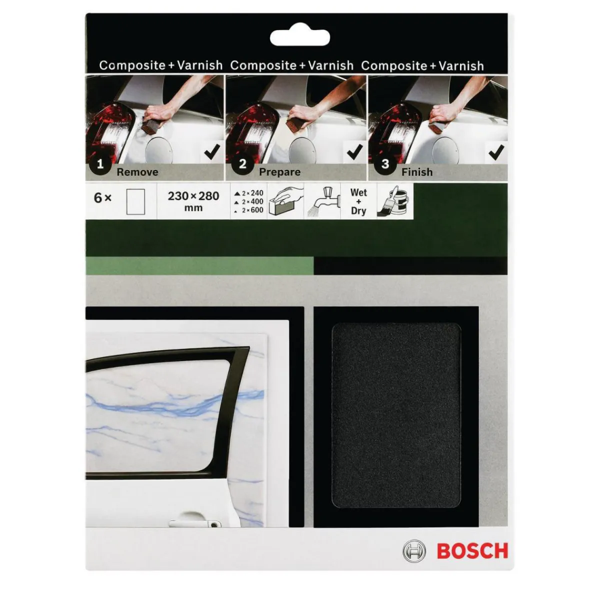 Mit dem Bosch DIY Handschleif-Set können Sie Holzoberflächen perfekt bearbeiten. Das Set enthält 2xK240K400K600 Schleifpapiere und ist in vier Teilen erhältlich.