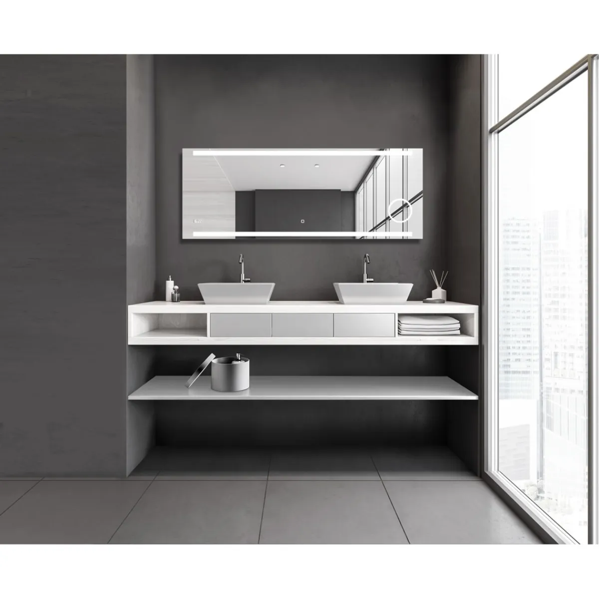 - Mit integrierter Digitaluhr, beleuchtetem Kosmetikspiegel und Touchsensor-Schalter ausgestattet