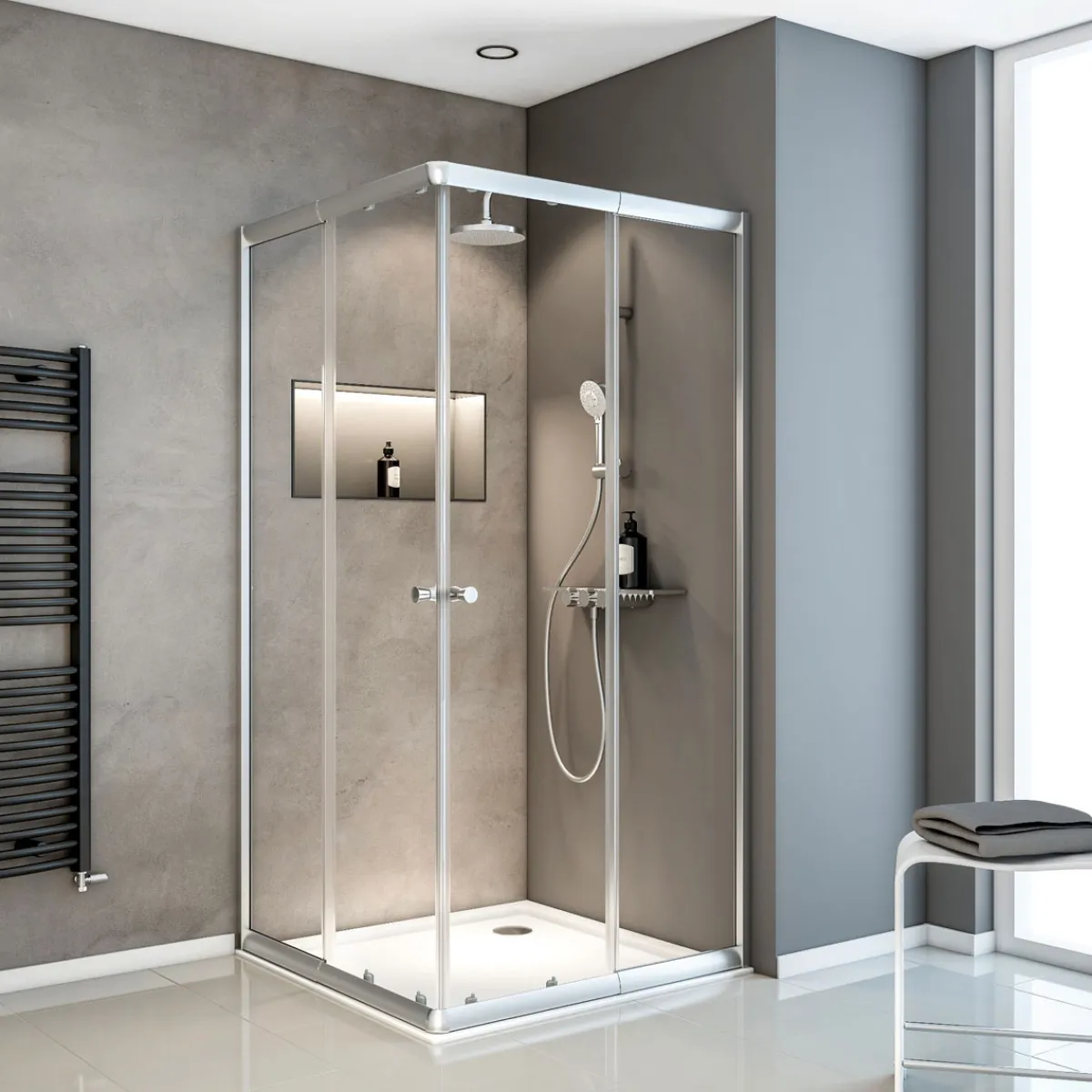 Der vierteilige Eckeinstieg mit Schiebetüren der Serie Sunny begeistert auf den ersten Blick mit großen Elementen aus Einscheibensicherheitsglas (ESG).