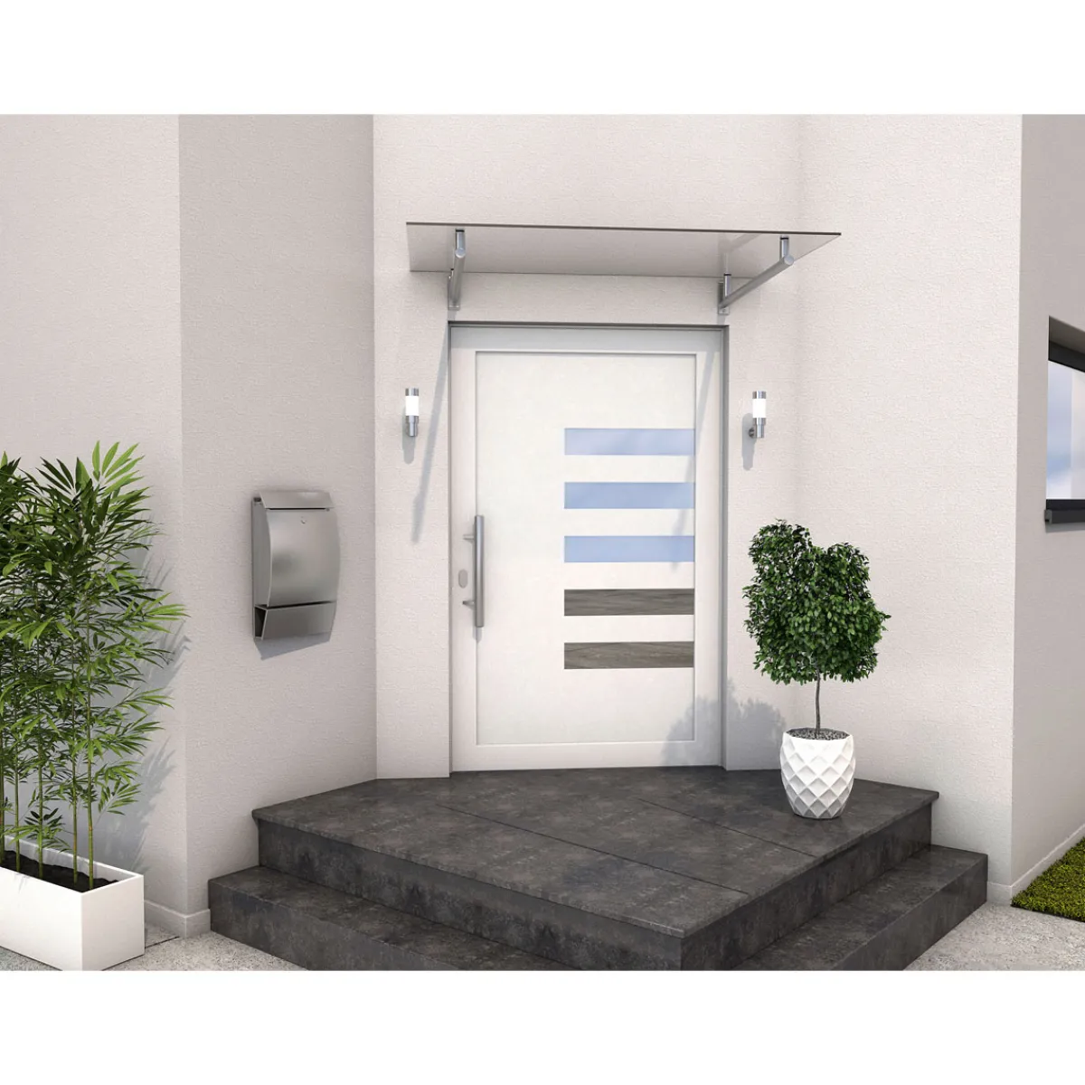 Das Premium-Vordach „HD 140“ von Durabil mit Edelstahl-Trägern und einer Abdeckung aus 8 mm starkem Verbundglas verleiht jedem Hauseingang durch sein edles und geradliniges Design eine ganz besondere Optik. Außerdem ist das Vordach „HD 140“ durch seinen Aufbau sehr robust und belastbar.