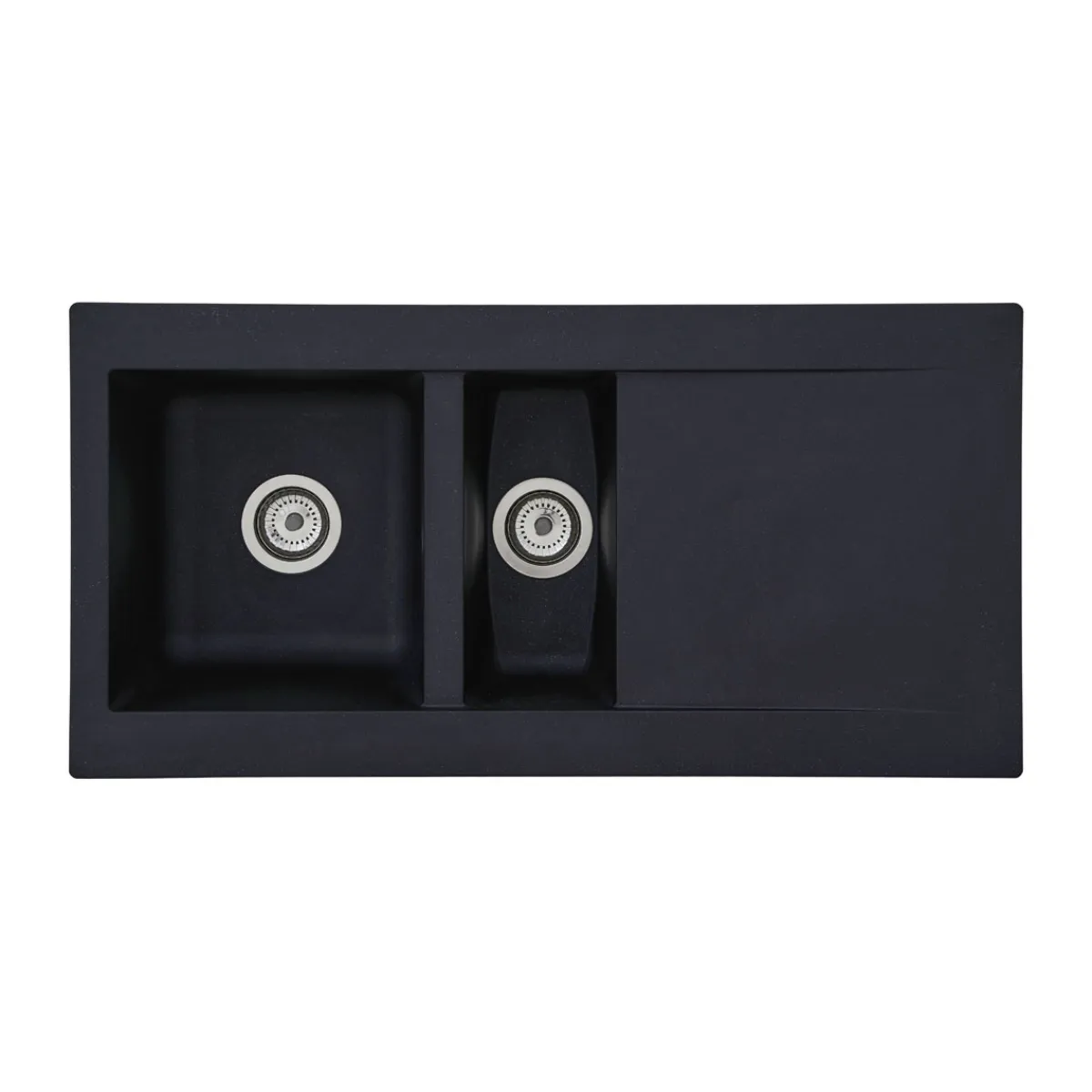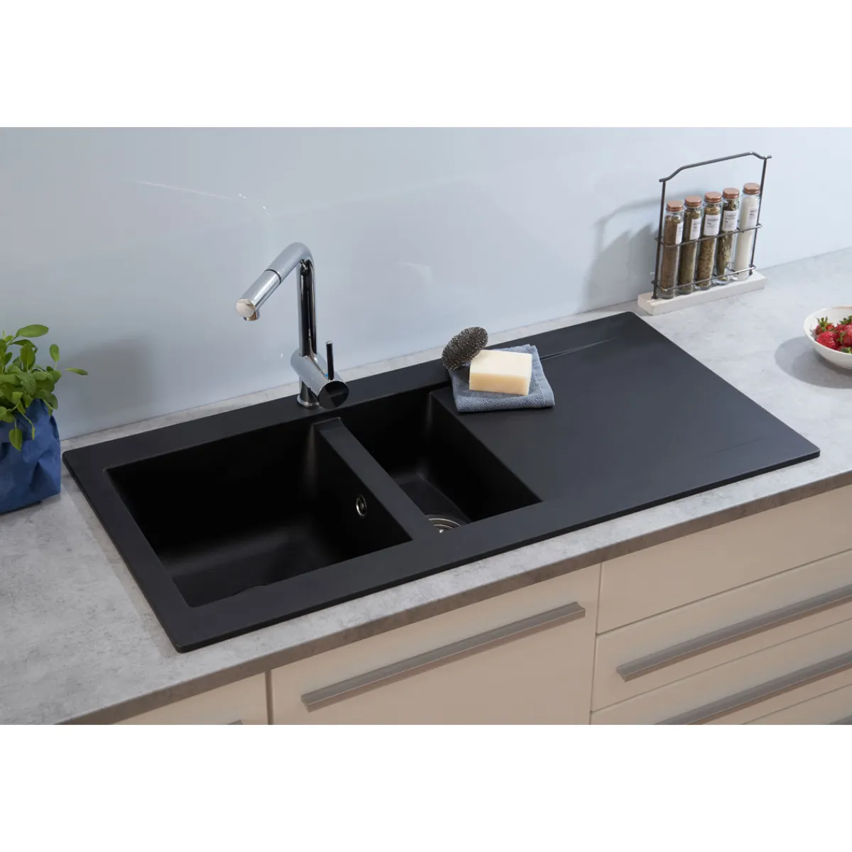 | Lieferumfang: | Inkl. Ablauf mit Siebkorb 90 mmInkl. Ab- und Überlaufgarnitur mit Raumspar-SiphonInkl. 6 Fixierklemmen zum Einbau (Für Arbeitsplatten mit Stärke 28 und 38 mm) |