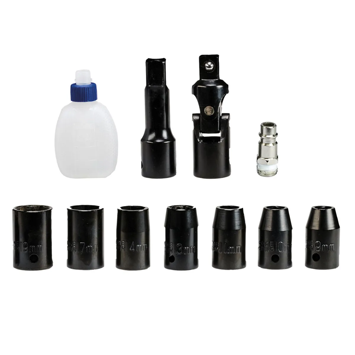 - – Lieferumfang: Druckluft-Ratschenschrauber, 7 Steckschlüsseln in den Größen 9/10/11/13/14/17/19 Millimeter, Verlängerung, Kardangelenk, Stecknippel, Ölfläschchen (ohne Öl), Transport- und Aufbewahrungskoffer
